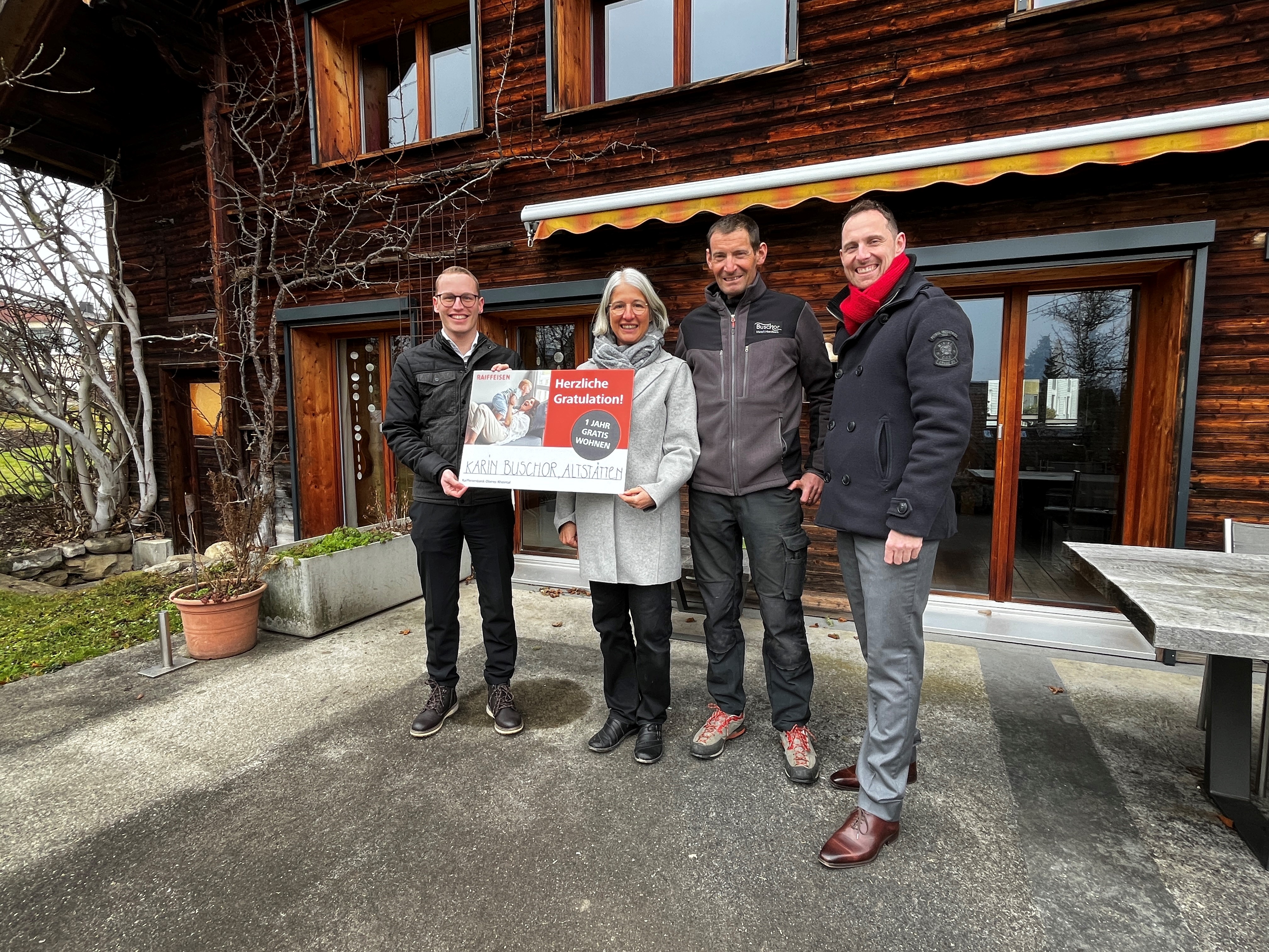 Luca Bigler (Privatkundenberater), Gewinner Karin und Andi Buschor gemeinsam mit Markus Rohner (Firmenkundenberater)