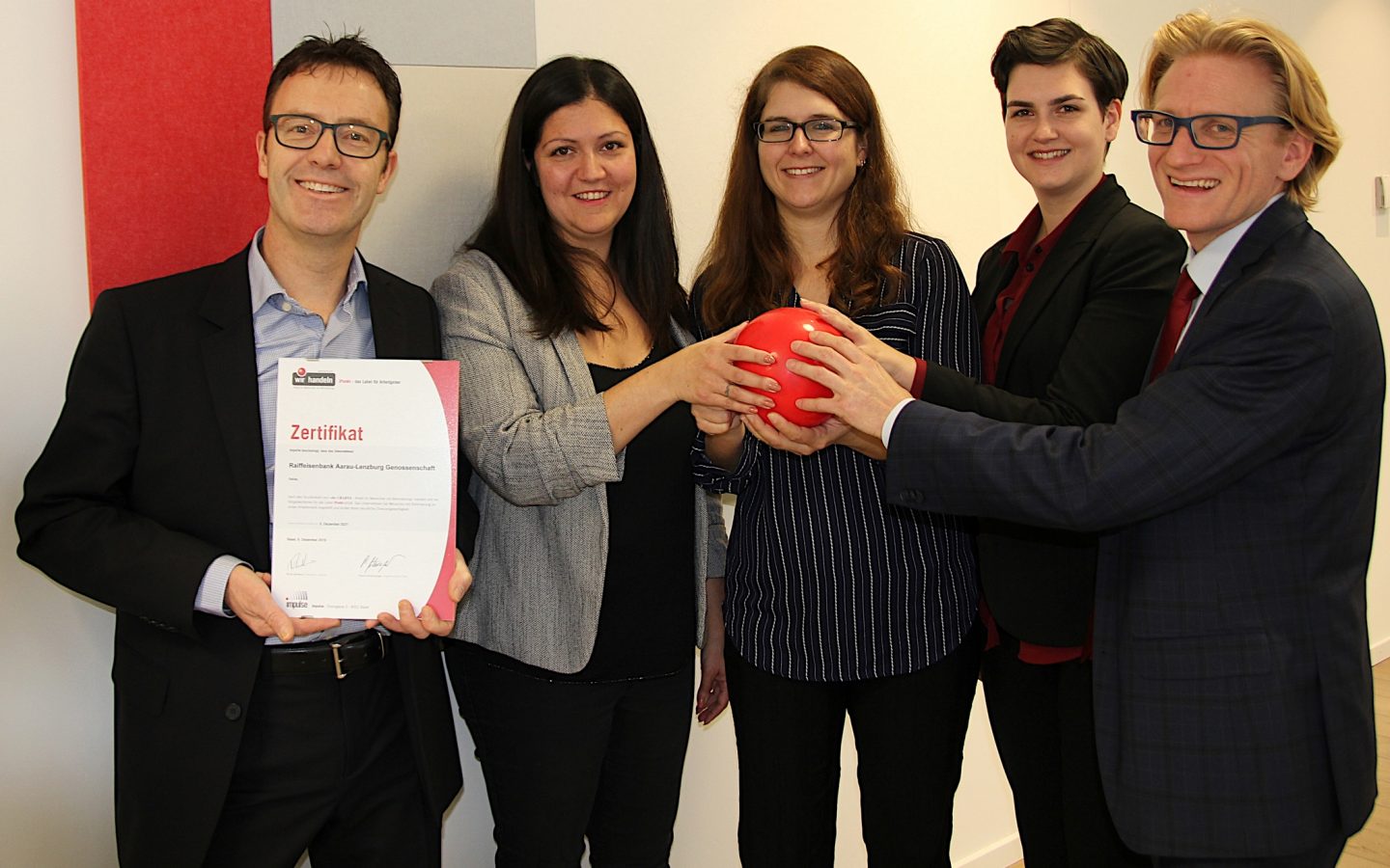 Christoph Wilhelm, Sabrina Weber, Daniela Hauri, Isabell Hunziker und Philipp Anliker von der Raiffeisenbank Aarau-Lenzburg mit dem iPunkt-Zertifikat.