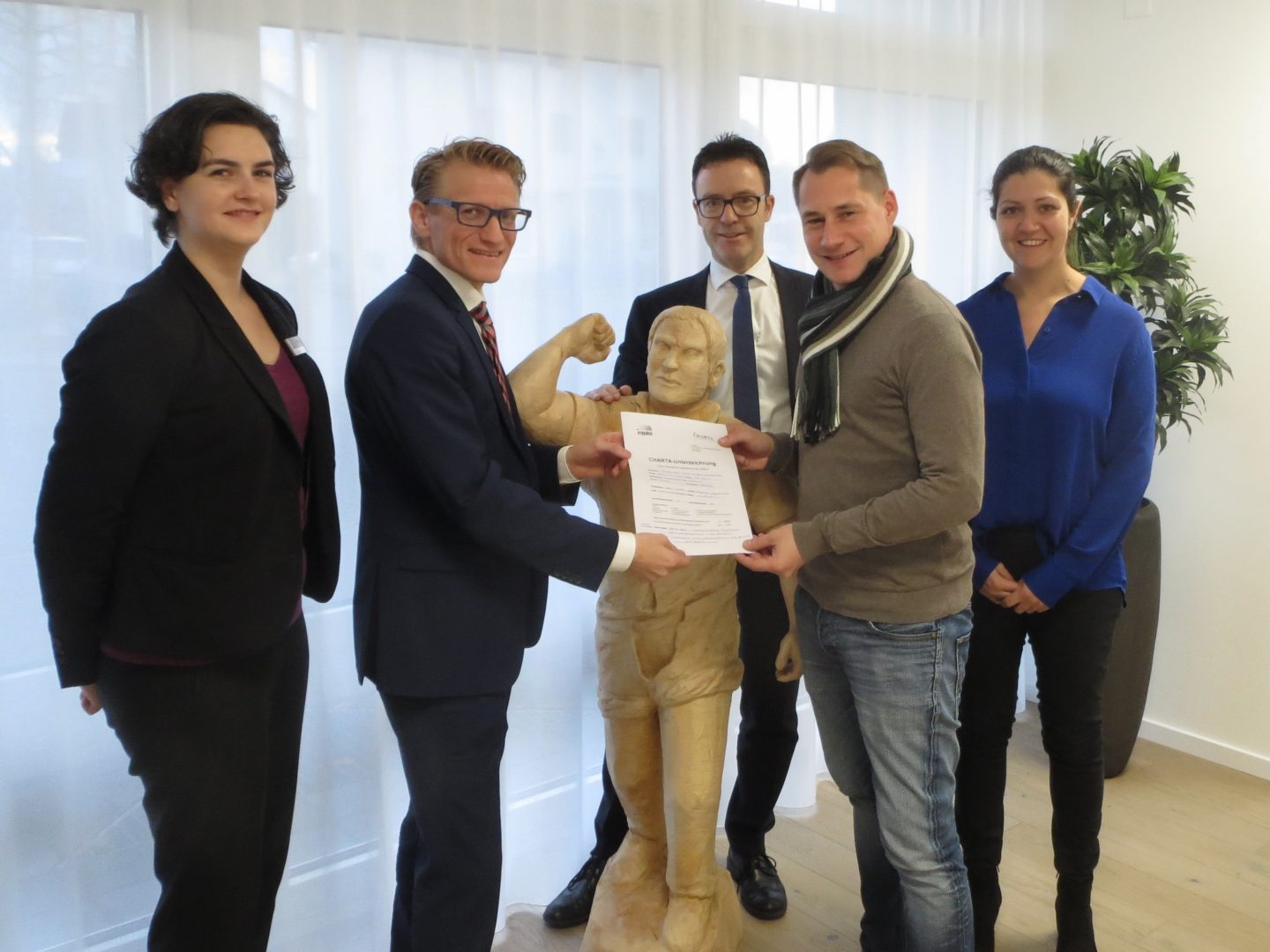 Anlässlich der Delegiertenversammlung vom 22. November 2018 hat die Raiffeisenbank Aarau-Lenzburg «die CHARTA» unterzeichnet und bekennt sich so freiwillig für die Chancengerechtigkeit und Nicht-Diskriminierung von Menschen mit Behinderung in der Berufswelt. Isabell Hunziker, Sabrina Weber, Philipp Anliker (Mitarbeitende der Raiffeisenbank) und Bankleitungsmitglied Christoph Wilhelm haben am 11. Dezember 2018 die unterzeichnete Charta an Guido Herklotz von Impulse übergeben. Die Raiffeisenbank Aarau-Lenzburg ist nun bestrebt, die Voraussetzungen zu schaffen, um das «Label iPunkt» zu erhalten und einen Menschen mit Behinderung anzustellen.