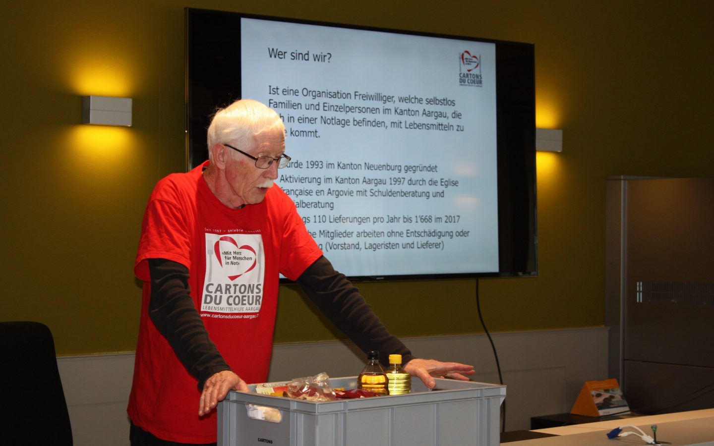„Die Schweiz wird regelmässig zu den reichsten Ländern der Welt gezählt. Und doch sind rund 570‘000 Menschen in unserem Land von Armut betroffen“, führte Jakob Haller gleich zu Beginn des Referates aus. Für die Betroffenen bedeutet Armut, sich in diversen Lebensbereichen einschränken zu müssen. Eine unausgewogene und ungesunde Ernährung ist eine häufige Begleiterscheinung davon. Hier versuchen unterschiedliche gemeinnützige Organisationen Abhilfe zu schaffen – eine davon ist Cartons du Coeur Aargau.