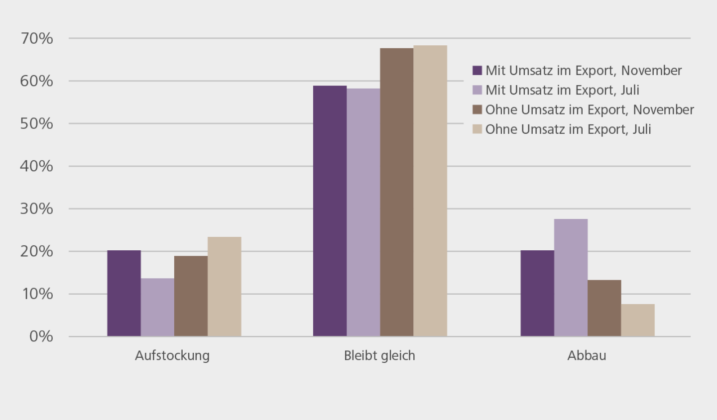 Als wichtigste Einflussfaktoren für die Erwartungen an das Jahr 2026 nennen die Unternehmen vor allem die Kundennachfrage (70% aller befragten KMU) und die allgemeine Konjunktur (44%). Weitere Aspekte sind die Wettbewerbssituation (25%), die geopolitische Entwicklung (21%) sowie – bei exportorientierten KMU – die Wechselkursentwicklung (28%). Etwas mehr als 15% der Unternehmen verweisen zudem auf den Fachkräftemangel und die Kostenentwicklung.