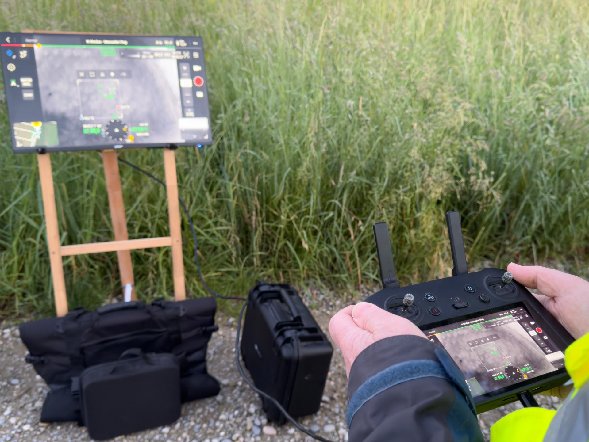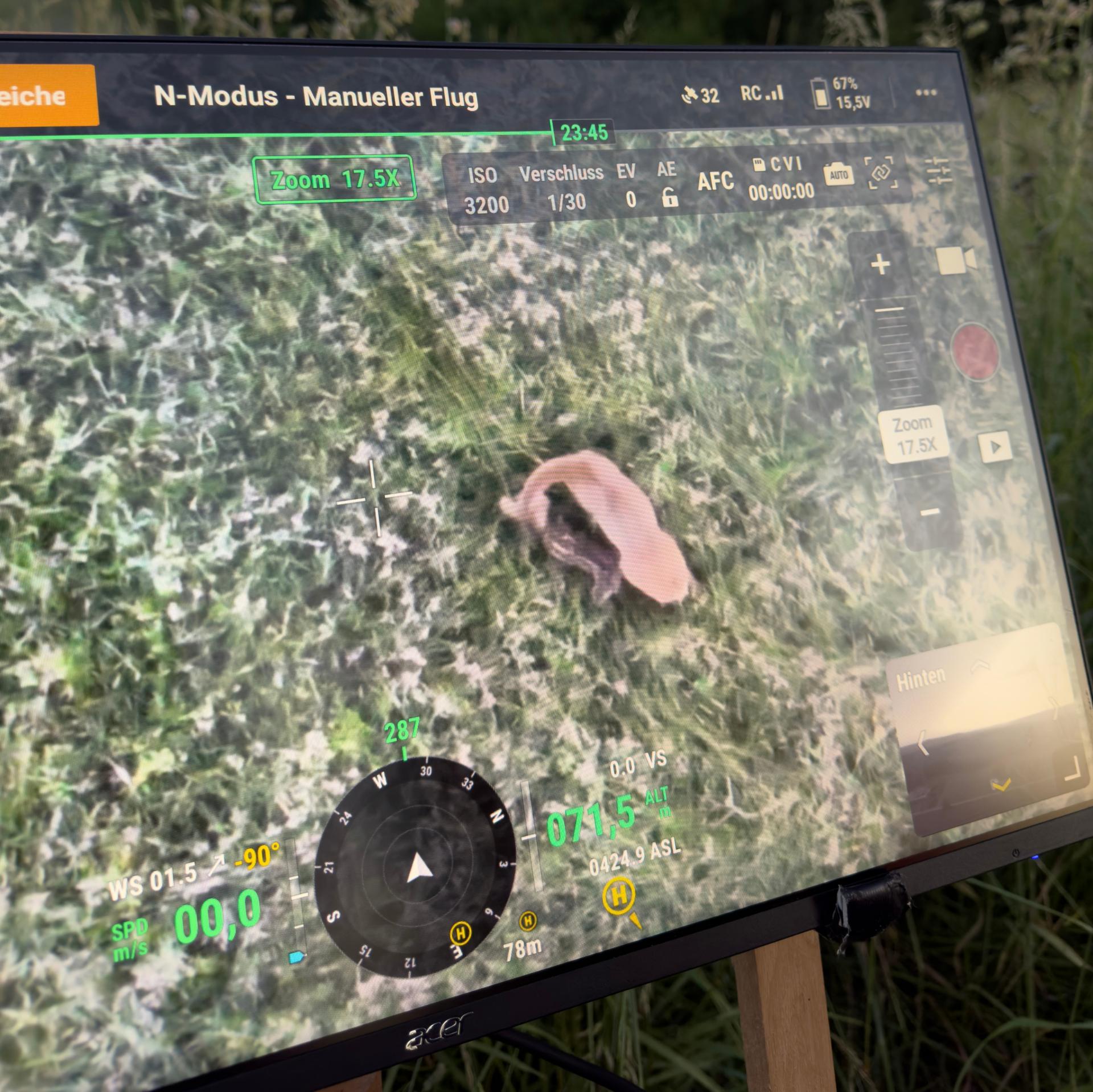 Die Drohne schwebt nun 70 Meter über dem Boden und fliegt automatisiert eine vorher festgelegte Route ab. Catherine Düblin, die Frau des Drohnenpiloten, beobachtet während dem Flug den Luftraum. «Es gibt Vögel, welche die Drohne angreifen könnten. Wenn zum Beispiel ein Milan seinen Horst in der Nähe hat, sieht er das Gebiet als sein Territorium und unser Fluggerät als Bedrohung.» Die Rehkitzrettung hat Glück: Nach bereits wenigen Sekunden Flug sind weisse Flecken auf dem Bildschirm ersichtlich. «Das könnte schon ein Rehkitz sein», freut sich der Drohnenpilot. Noch grösser ist die Freude, als er nach rund zehn Minuten eine besondere Entdeckung macht: Ein Rehkitz, das von seiner Mutter gesäugt wird. «Ein solches Ereignis habe ich noch nie erlebt. Das ist ein Glücksfall.»