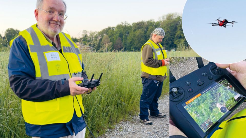 «Die Setzzeit ist ausgerechnet die Zeit, in der die Bauernbetriebe ihre Felder mähen», erklärt Peter Düblin, während er seine Drohne startklar macht. Der Tierarzt ist gemeinsam mit Daniel Zollo Mitbegründer der Rehkitzrettung Allschwil-Schönenbuch und ausgebildeter Drohnenpilot. «Die Bauern haben keine Chance, die Rehkitze mit blossem Auge zu orten und damit rechtzeitig zu entdecken.» Aus diesem Grund sind die freiwilligen Tierschützer unterwegs und suchen die Heuwiesen nach Jungtieren ab. Die Wärmebildkamera spürt die Rehkitze sehr zuverlässig auf. Ist ein Junges gefunden, weist der Drohnenpilot den Helfern und dem Jäger den Weg zur Fundstelle. Mit einer Harasse wird das Tier schliesslich geschützt, bis der Bauer die Mäharbeiten beendet hat. «Nur der Jäger ist dazu berechtigt, Wildtiere zu handhaben», betont Düblin.