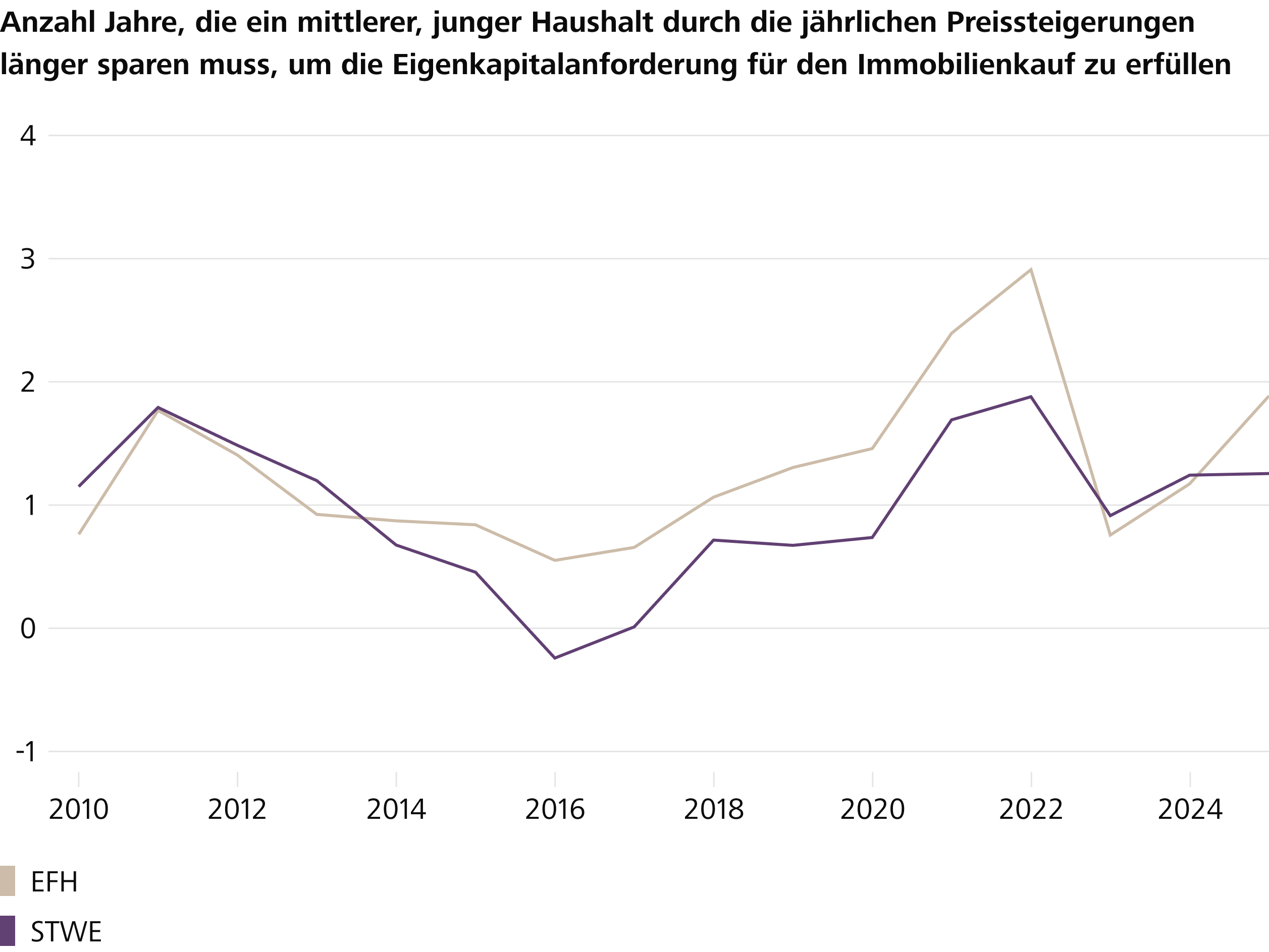 Die Preise für Wohneigentum sind 2025 erneut kräftig gestiegen und haben die Eintrittshürden für Kaufinteressierte weiter erhöht. Allein im vergangenen Jahr verteuerten sich Eigentumswohnungen durchschnittlich um 36'000 Franken, Einfamilienhäuser um 55'000 Franken. Bei derart starken Preissprüngen wächst der Kapitalbedarf schneller, als die meisten Haushalte sparen können. Mittlerweile sind erhebliche Eigenkapitalbeträge notwendig, um die Belehnung so weit zu senken, dass die geltenden Tragbarkeitsregeln eingehalten werden. Für die Mehrheit der Schweizer Haushalte rückt der Traum vom Eigenheim damit selbst bei grosser Spardisziplin in weite Ferne. Noch im Jahr 2010 hätten einem durchschnittlichen jungen Haushalt zehn Jahre Sparen genügt, um ein mittleres Einfamilienhaus zu erwerben. Heute sind es 28 Jahre. Fredy Hasenmaile verdeutlicht: «Allein die Preisanstiege des vergangenen Jahres haben die benötigte Spardauer für eine Eigentumswohnung um 1,2 Jahre und für ein Einfamilienhaus um 1,8 Jahre verlängert. Selbst wenn man also kräftig spart, rückt das Sparziel nicht näher, sondern entfernt sich weiter».