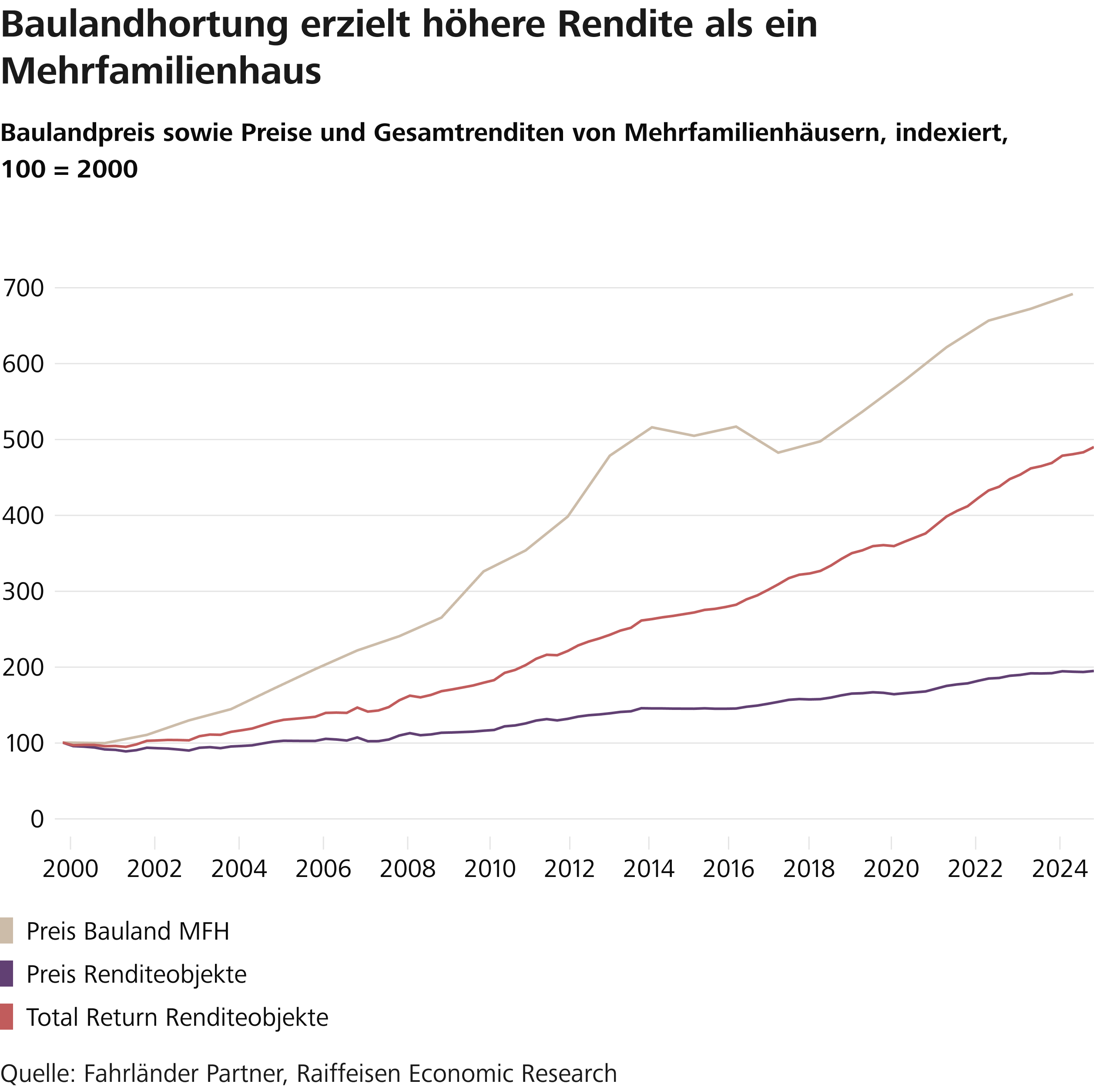 St.Gallen, 19. Februar 2026. Weniger als ein Drittel der neu erstellten Wohnungen in der Schweiz wird heute noch auf unbebautem Bauland realisiert. Je nach Berechnungsgrundlage sind in der Schweiz 9,0 bis 16,7 Prozent der Wohnbauzonen noch unbebaut. Basierend auf der heutigen baulichen Dichte würden diese Baulandreserven Wohnraum für mindestens 950’000 Personen bieten. Tatsächlich dürften es aufgrund dichterer Bauweise und weil immer weniger Zweitwohnungen gebaut werden, sogar bis zu 1,5 Millionen Menschen sein. Von diesen Baulandreserven sind jedoch längst nicht alle Flächen verfügbar. Im Kanton Zürich ist beispielsweise ein Viertel des unbebauten Baulands noch gar nicht baureif. Zusätzlich weist ein Grossteil der verbleibenden Parzellen eine ungenügende Qualität auf, beispielsweise aufgrund ungünstiger Topografie, Naturgefahren, schlechter ÖV-Anbindung oder einer unattraktiven Mikrolage. Beim Grossteil der Reserven verhindert jedoch das fehlende Interesse der Eigentümerschaft eine Überbauung. «Das herrschende Raumplanungsregime macht die Hortung von Bauland oft lukrativer als dessen Bebauung. Unsere Berechnungen zeigen, dass innerhalb der letzten 25 Jahre mit der Hortung von Bauland eine Rendite von 592 Prozent hätte erzielt werden können. Das ist deutlich mehr als die 400 Prozent, welche die Realisierung und Vermietung eines Mehrfamilienhauses inklusive Wertsteigerungen im gleichen Zeitraum abgeworfen hätte – und dies erst noch mit substanziell tieferen Risiken», erklärt Fredy Hasenmaile, Chefökonom von Raiffeisen Schweiz. Hinzu kommt, dass unbebautes Bauland häufig opportunistische Nutzungen zulässt – etwa als Parkplatz, Lagerfläche oder zur Freihaltung von Sichtachsen sowie zur langfristigen Reservierung für kommende Generationen, was im Renditevergleich nicht berücksichtigt wurde.