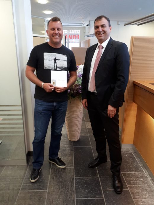 Der 10 g Goldbarren wurde vom Geschäftsstellenleiter René Sidler an den strahlenden Gewinner überreicht.