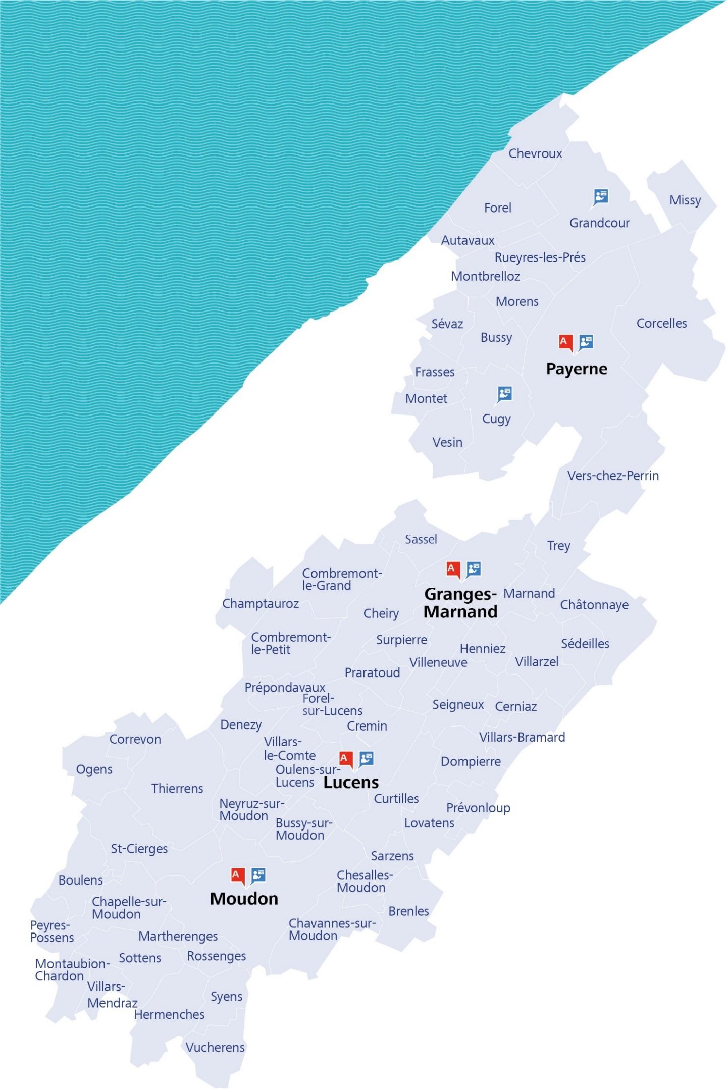 Le rayon d'activité de la Banque Raiffeisen de la Broye s'étend aux localités suivantes: