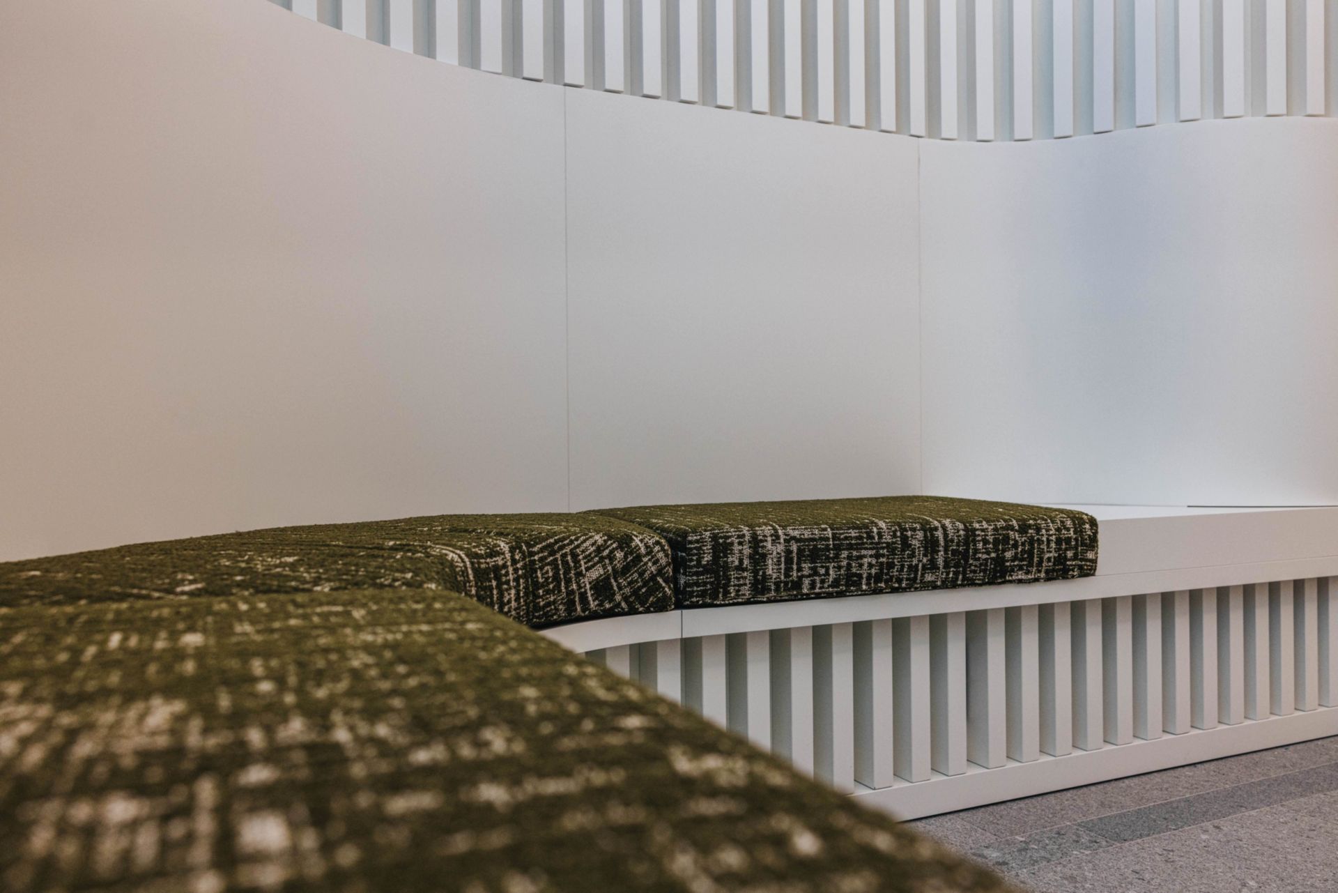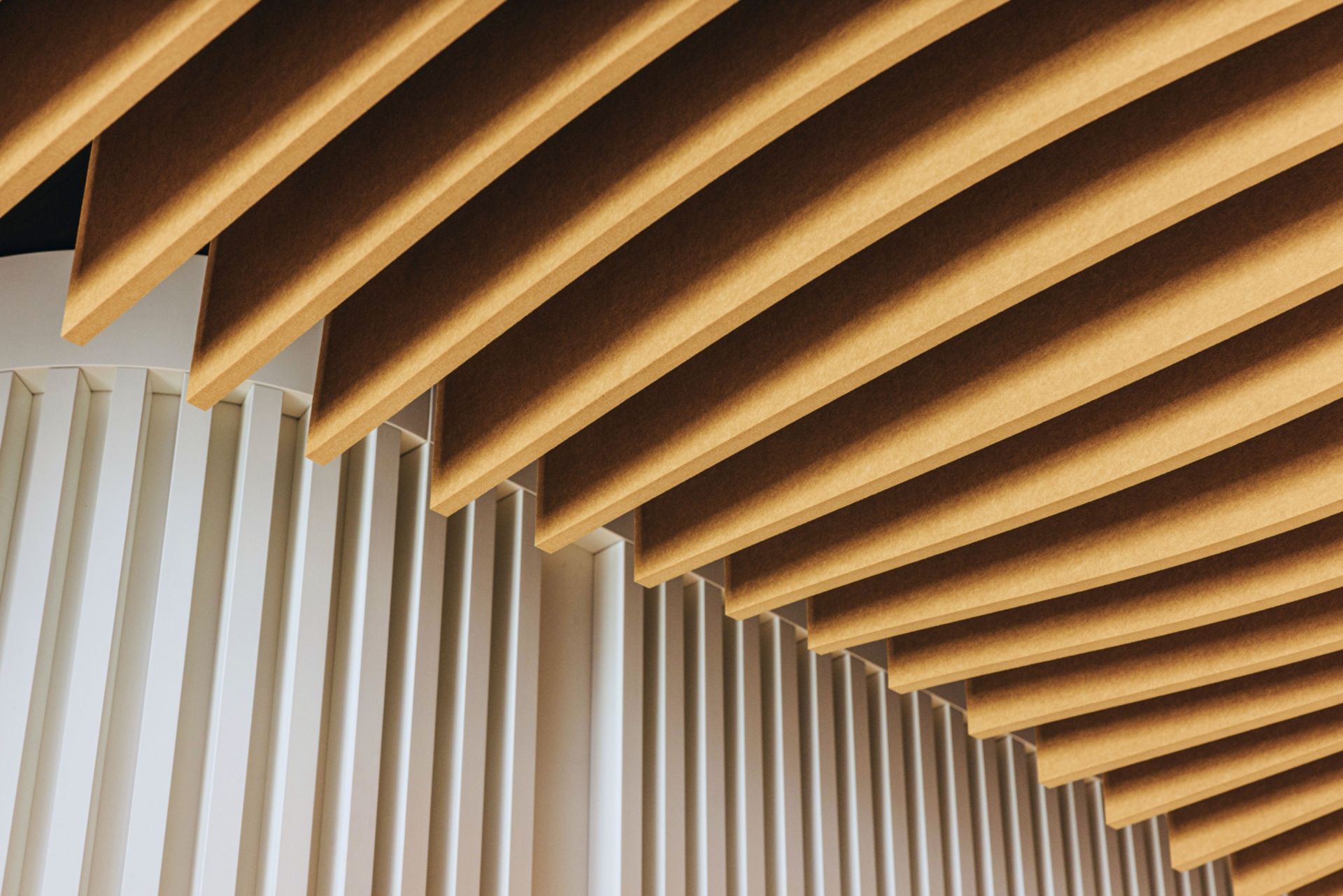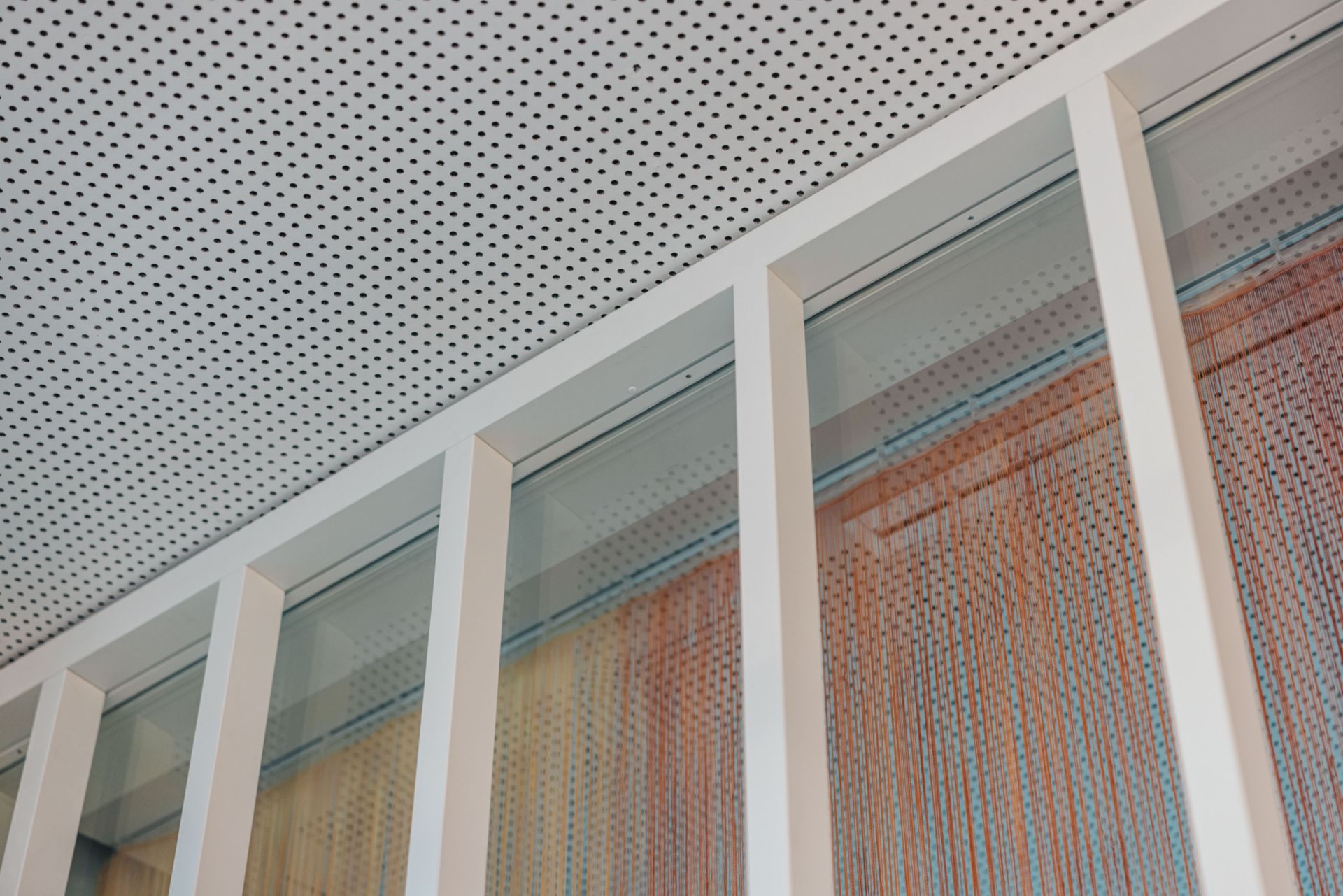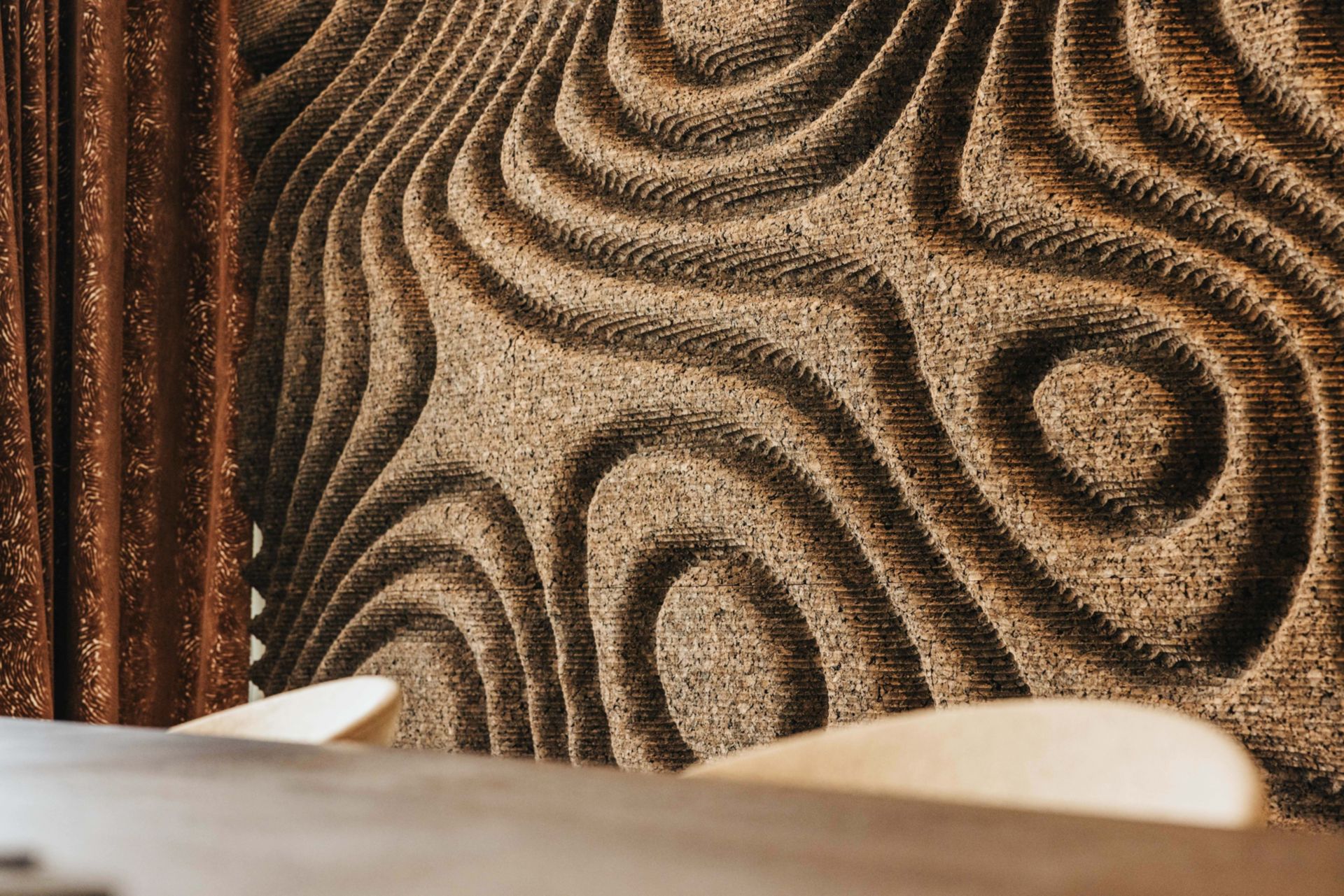 En périphérie du volume principal en noyer, les 8 salons conseils sont dissimulés derrière une paroi habillée de tasseaux qui évoque la linéarité des étendues de vignes qui dessine le paysage. Le travail d’alternance entre les pleins et les vides des menuiseries blanches apporte un rythme vibrant au parcours client. La géométrie du parcours rappelle la forme naturelle des méandres. Ce jeu permet d’offrir la discrétion des perspectives aux clients et aux collaborateurs lors d’un conseil. Il est complété par un dispositif de rideaux fils aux teintes arboricoles reflétant les saisons de la vigne habille les parois vitrées à l’intérieur des salons conseils. Ils ont été colorés dans une approche artistique spécialement conçue pour le projet. Ce geste capture l’essence du paysage extérieur et l’amène à l’intérieur.