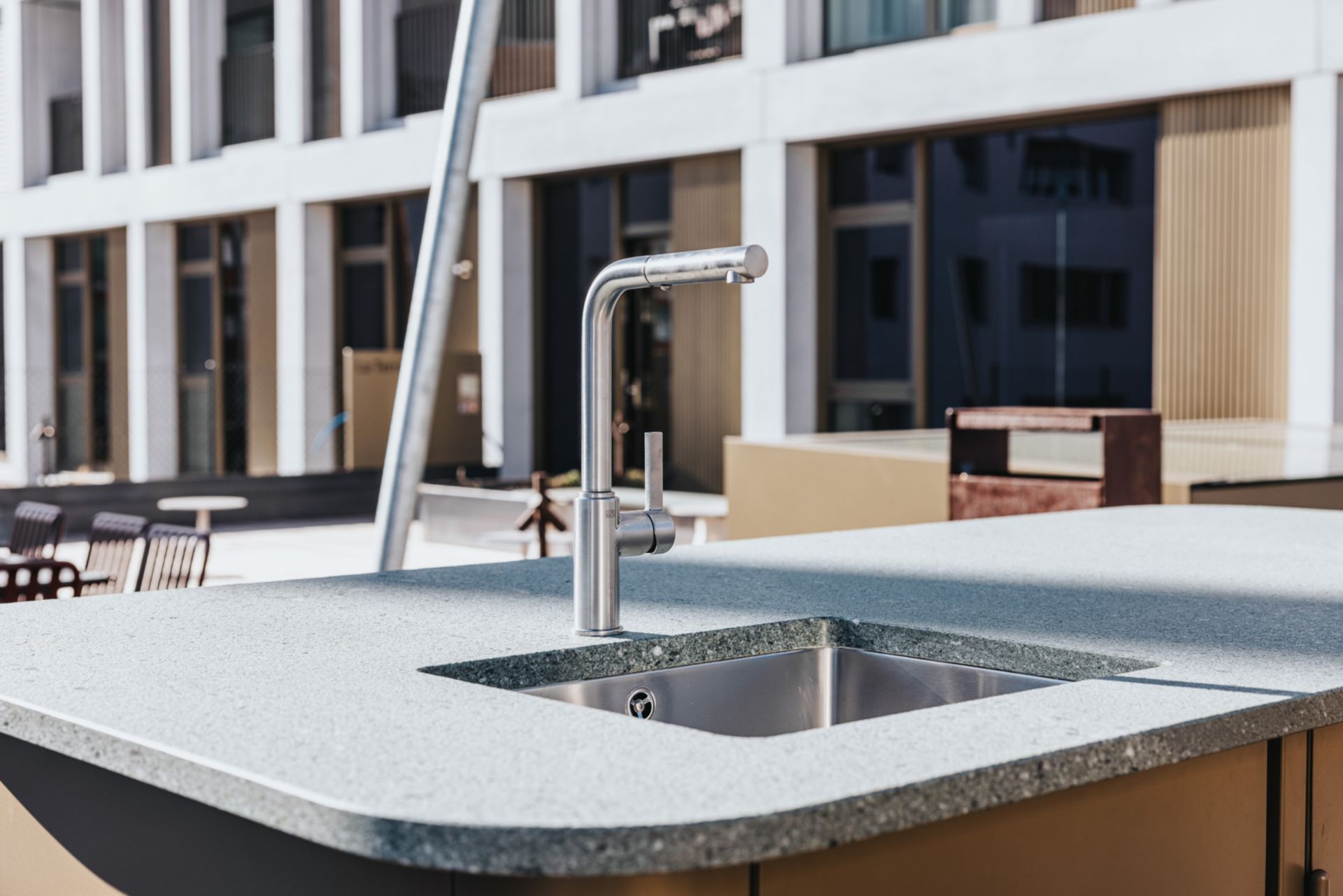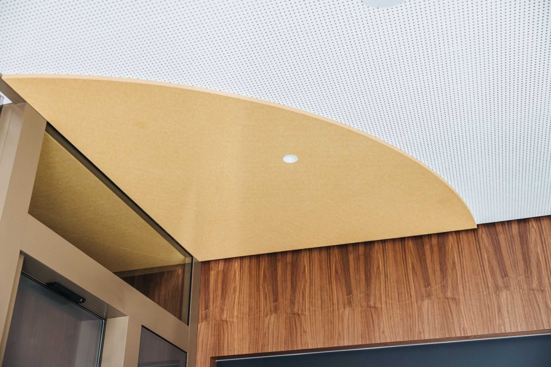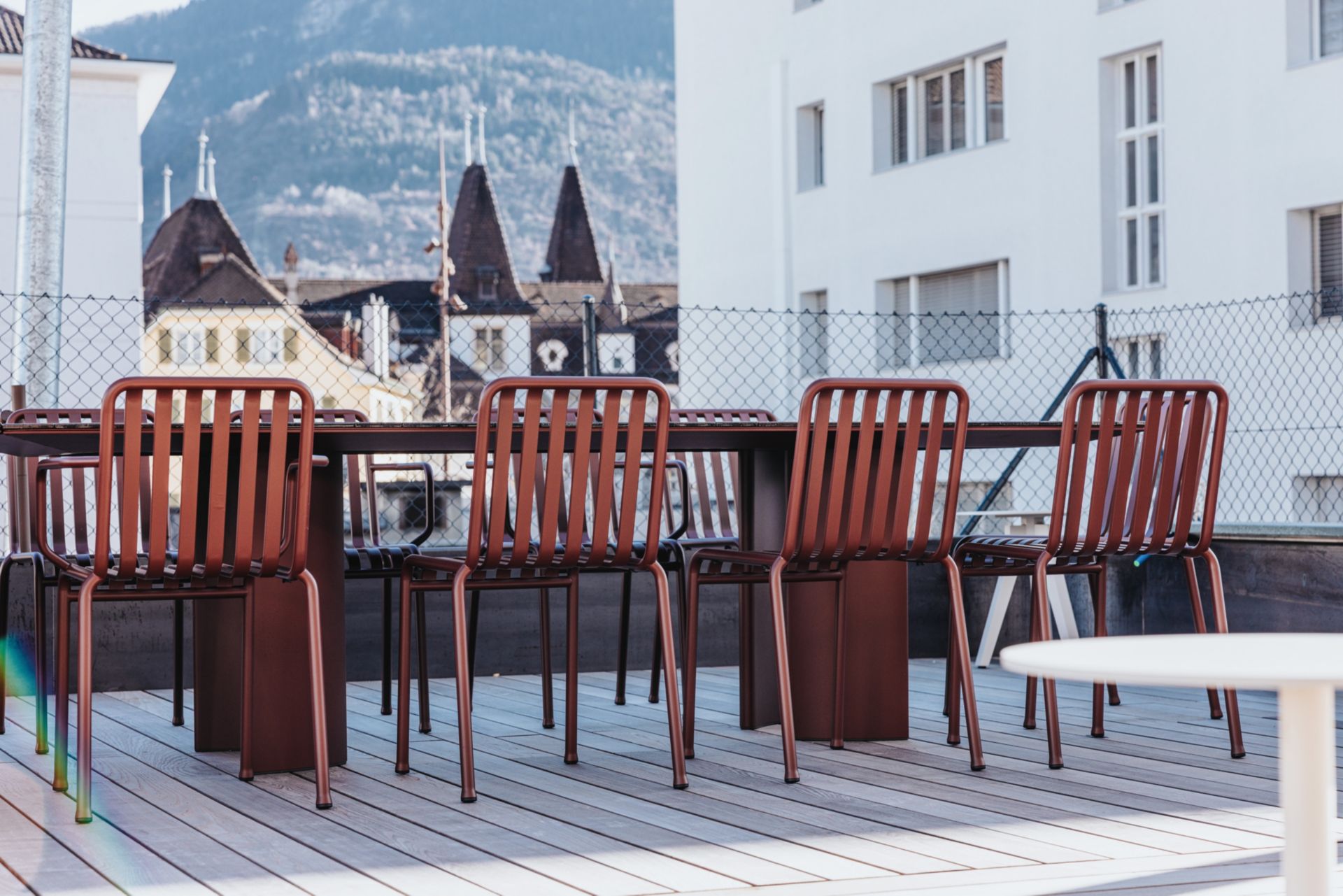 Au centre du plan, la place du marché se veut le point de rencontre pour les pauses café. Là aussi, le noyer est omniprésent et apporte chaleur et raffinement discret. Trois suspensions acoustiques oloïdales d’un jaune doré occupent la troisième dimension. Finalement, la généreuse terrasse accessible depuis la place de marché est revêtue de frêne thermo-traité. Le mobilier emprunte des teintes de bordeaux, clin d’oeil aux tanins des cépages rouges, en harmonie avec la façade de l’immeuble Anhinga et les matériaux de la terrasse.
