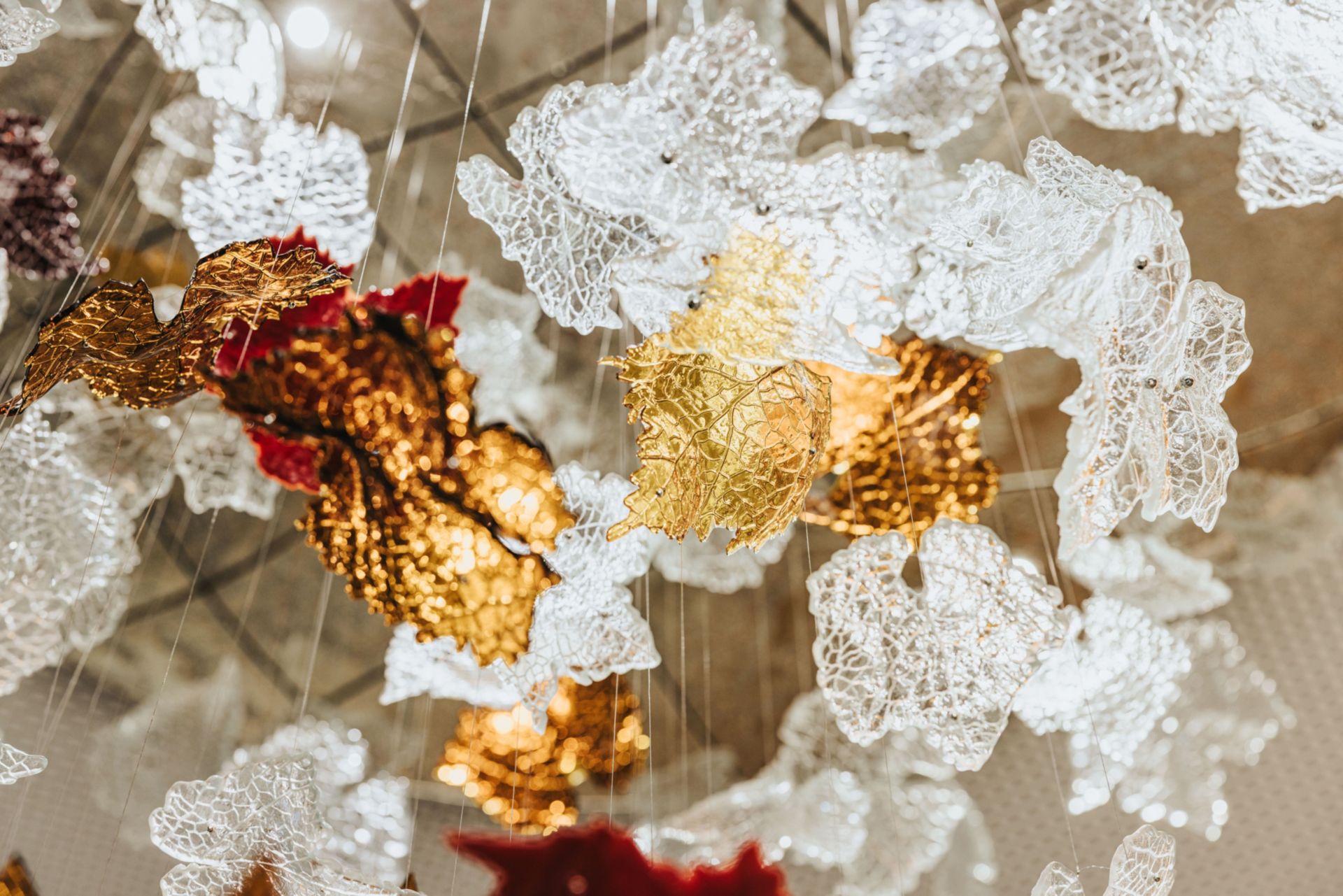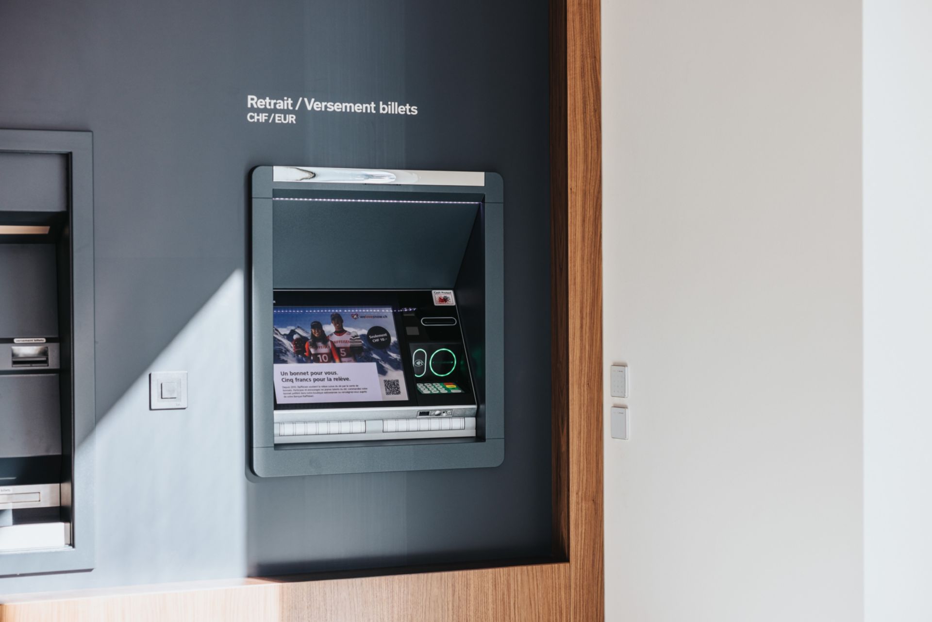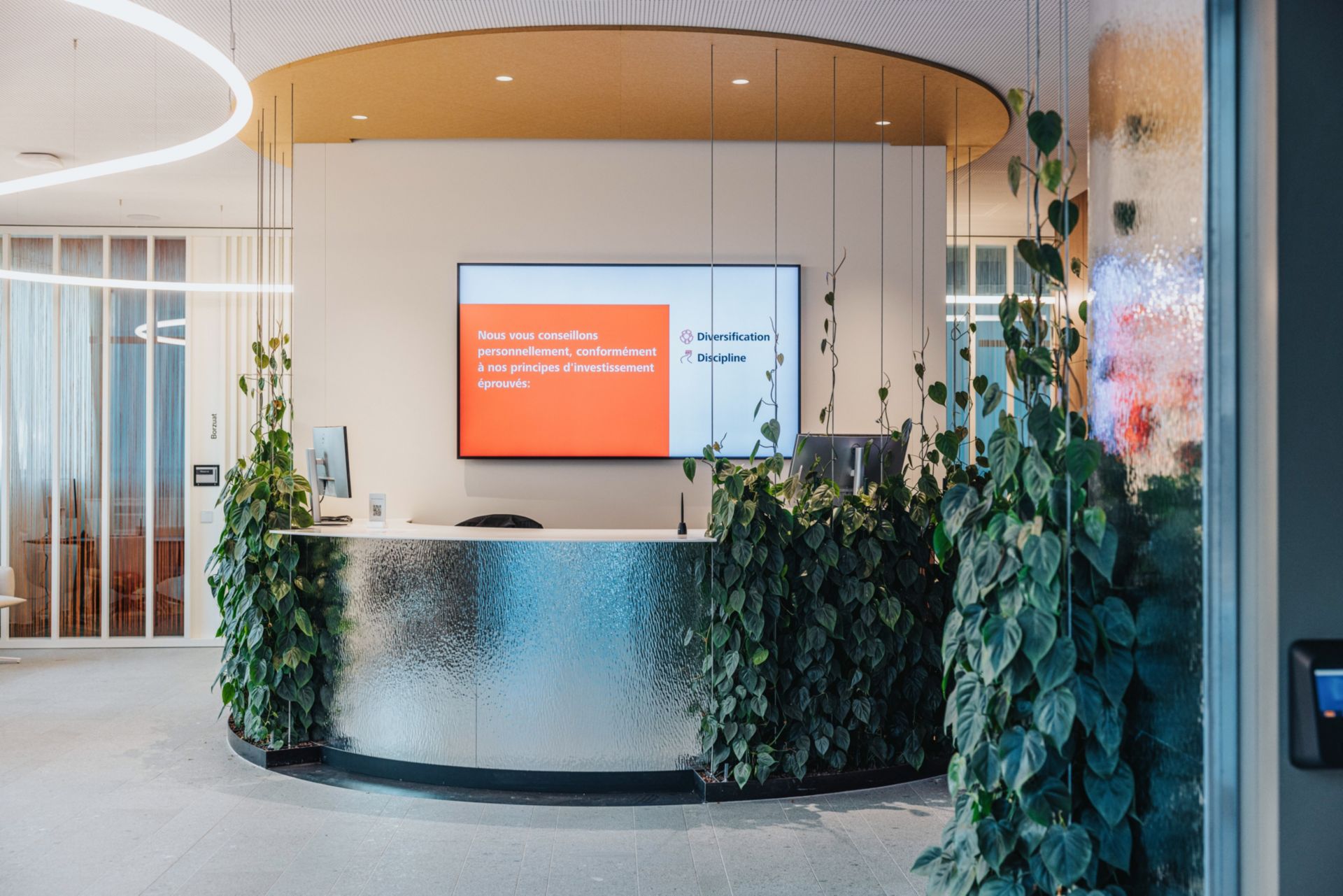 L’entrée s’inscrit naturellement dans l’angle ouvert du bâtiment à proximité de l’Avenue du Château pour assurer une présence forte au niveau de la rue. Le début du parcours client débouche sur une zone de services bancaires directement connectée à l’espace d’accueil spatialement généreux. Point focal de cet espace de réception, le sculptural lustre «Vitis Vivendo», une oeuvre de 2m50 en verre, capture le cycle de la vie à travers des feuilles de vignes de verre tombant délicatement. Ce processus métaphorique, appréhendant l’éphémère et le durable, souligne la longévité de la vigne, qui perd ses feuilles chaque année, mais se régénère inlassablement, perpétuant ainsi son existence.