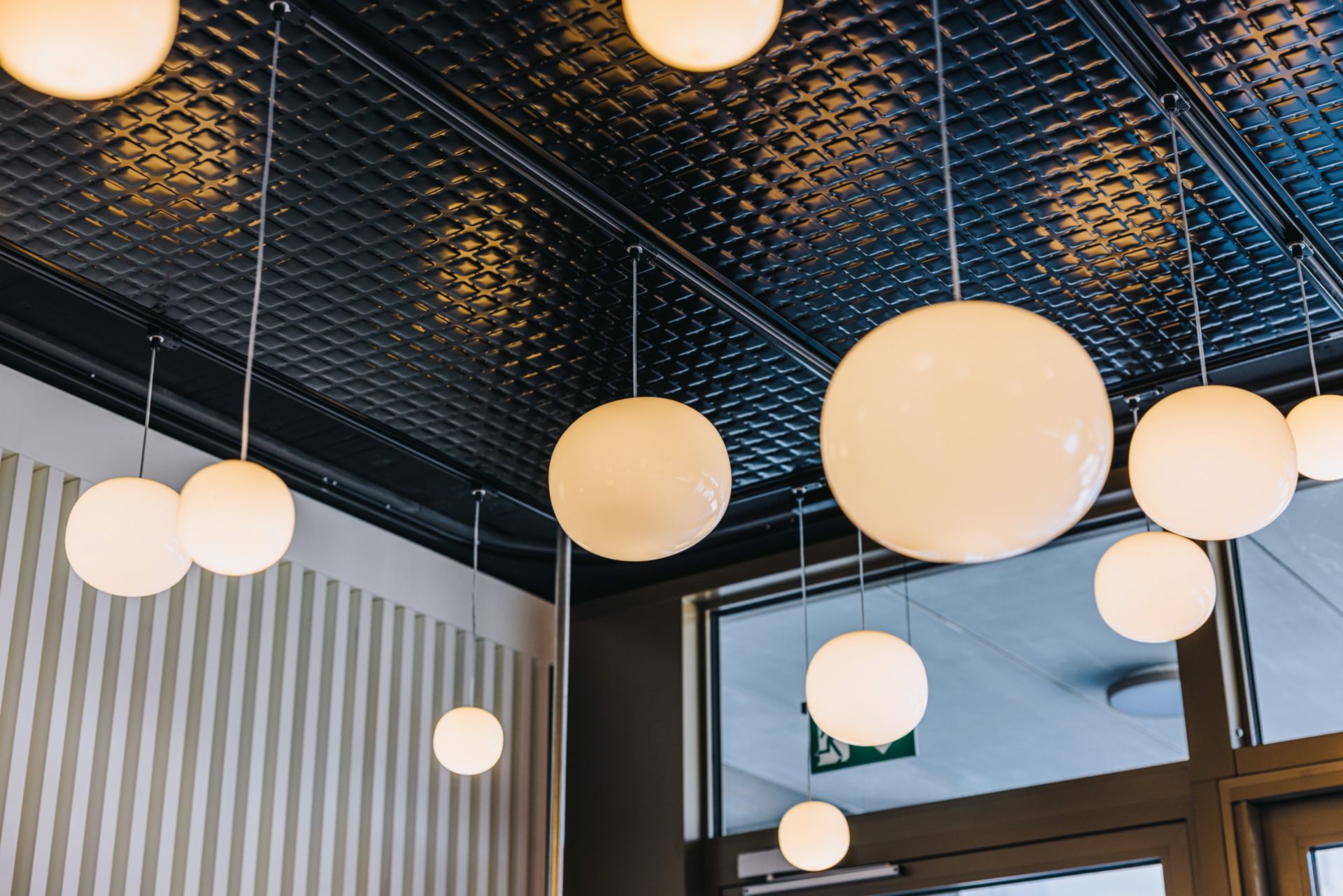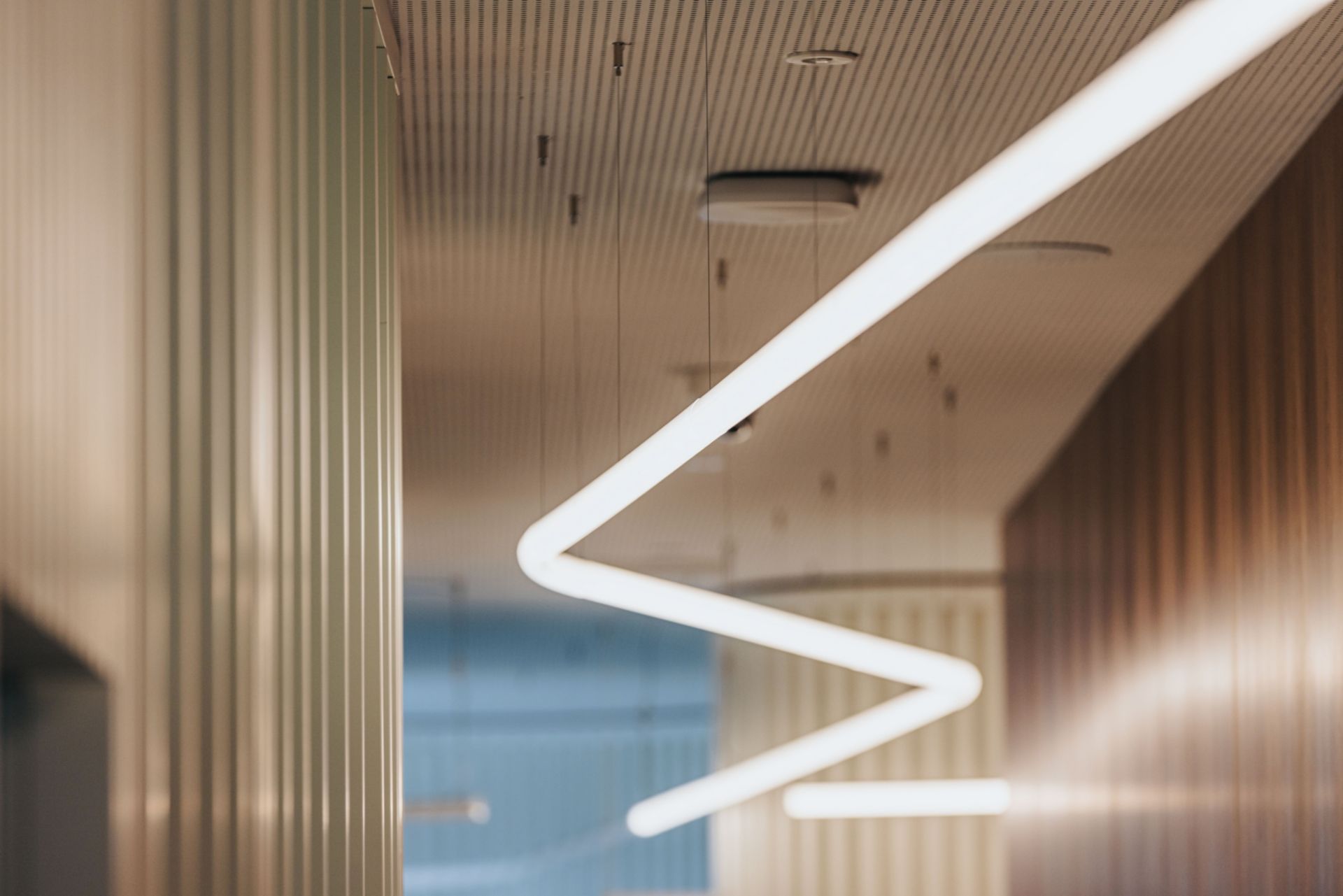 Au plafond, un flux de lumière diffusant une lumière douce et raffinée, tels les rayons crépusculaires propres à l’emblème de Sierre, devient le fil conducteur du parcours client. Son tracé organique file, tout comme le client, à travers le vignoble, marquant des zones de rencontre là où il décrit des formes organiques et des zones de circulation. Le flux lumineux du rez-de-chaussée s’éclate ensuite dans l’espace event, symbolisant le grain de raisin, fruit de la vigne porté à maturation par l’ensoleillement sierrois.