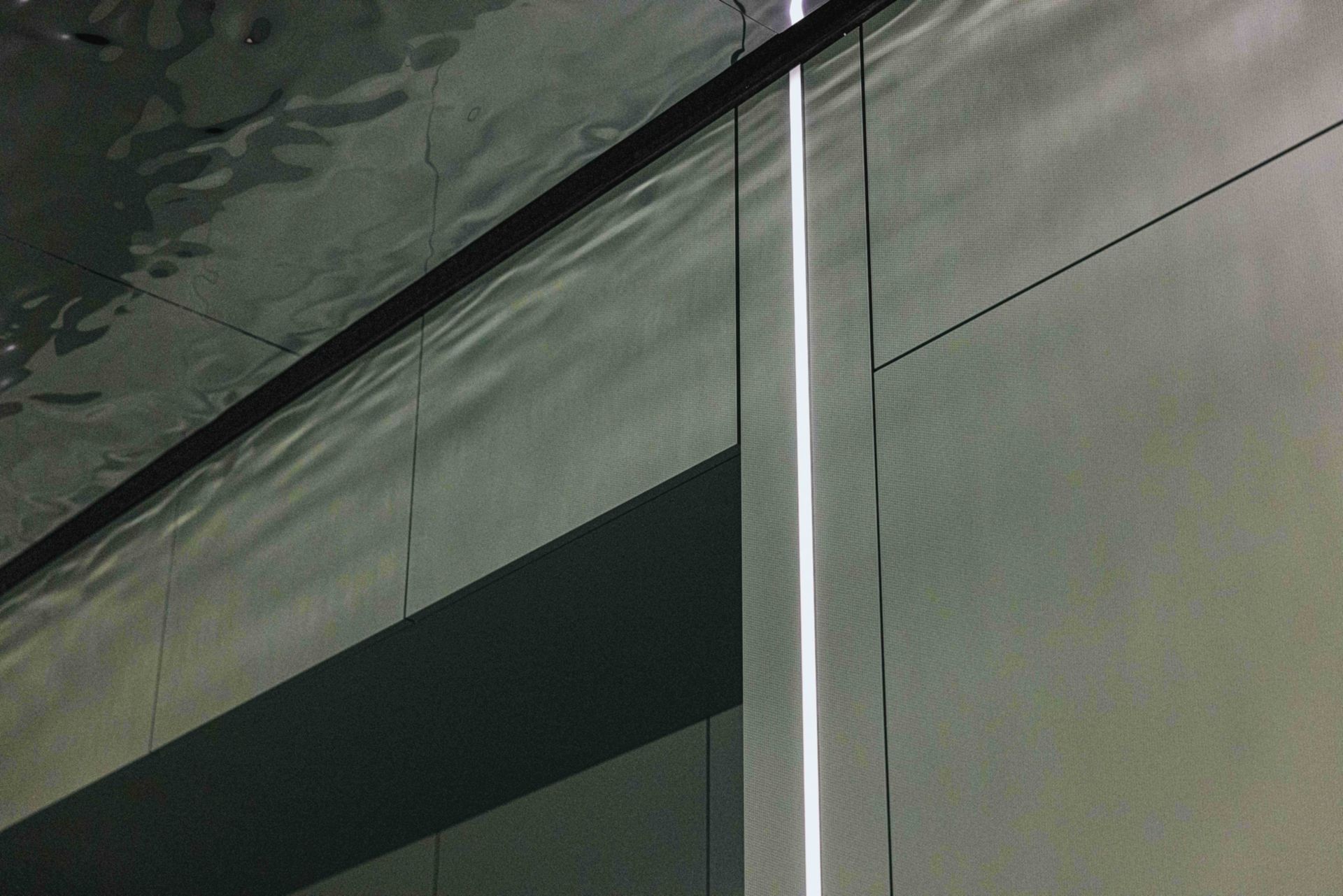 Un caractère fort et unique a été souhaité pour le salon dédié à la clientèle Jeunesse de l’institut bancaire. Le traitement monochrome de la pièce dans une teinte végétale participe à l’immersion recherchée pour les conseils qui se dérouleront en partie de manière virtuelle dans cet espace. La sélection de l’inox au sol et du métal bosselé du plafond inverse les réalités et donne cette sensation d’étendue lacustre subtilement renforcée pour les jeux de reflets de l’éclairage au plafond.