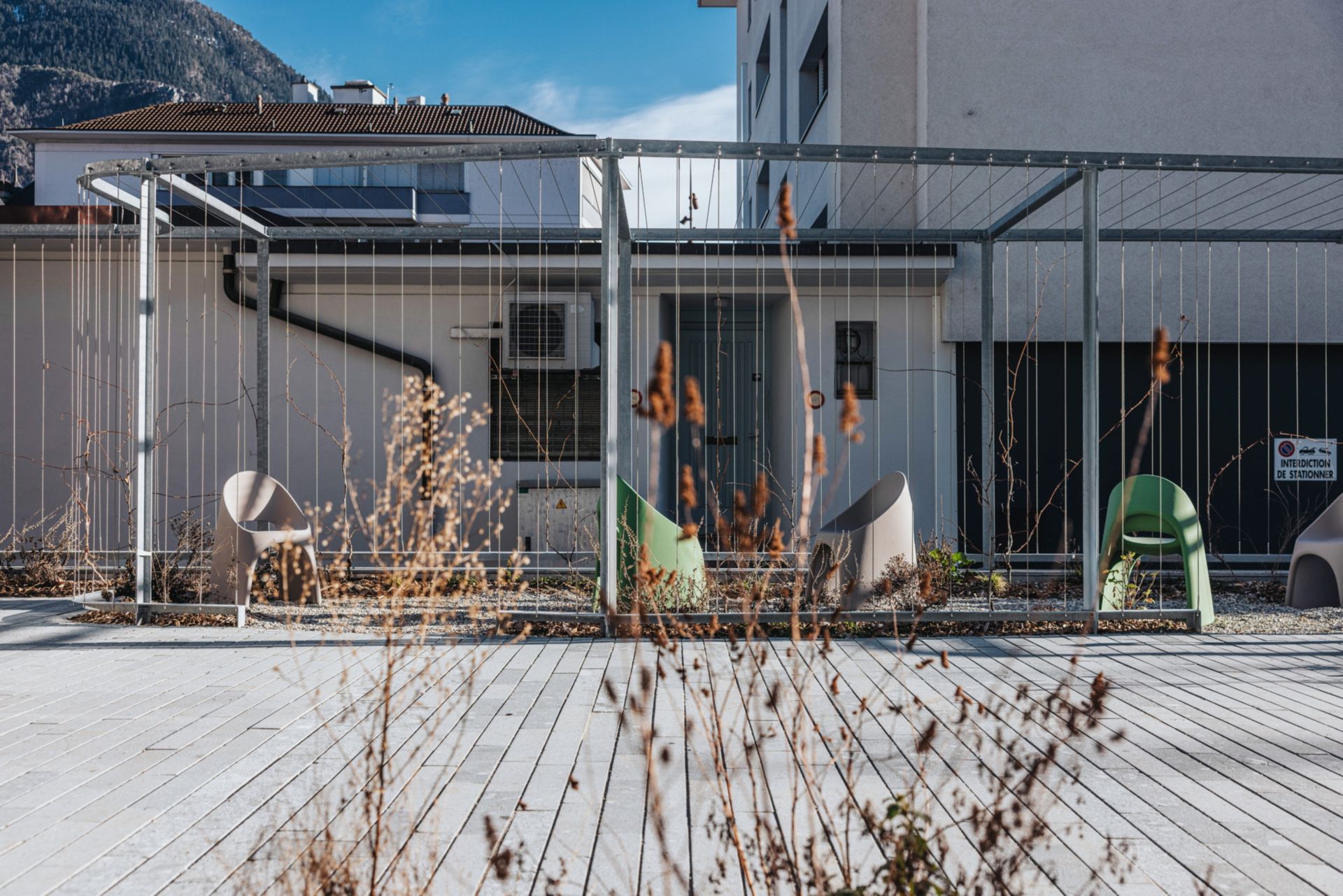 Le concept de matérialité reflète une immersion contemporaine dans le monde de la vigne et du vin. Le choix des matériaux retranscrit les éléments composant le paysage viticole : le terroir, la linéarité des parcelles de vigne, le fruit de la vigne, le soleil de Sierre et l’eau par ses méandres.