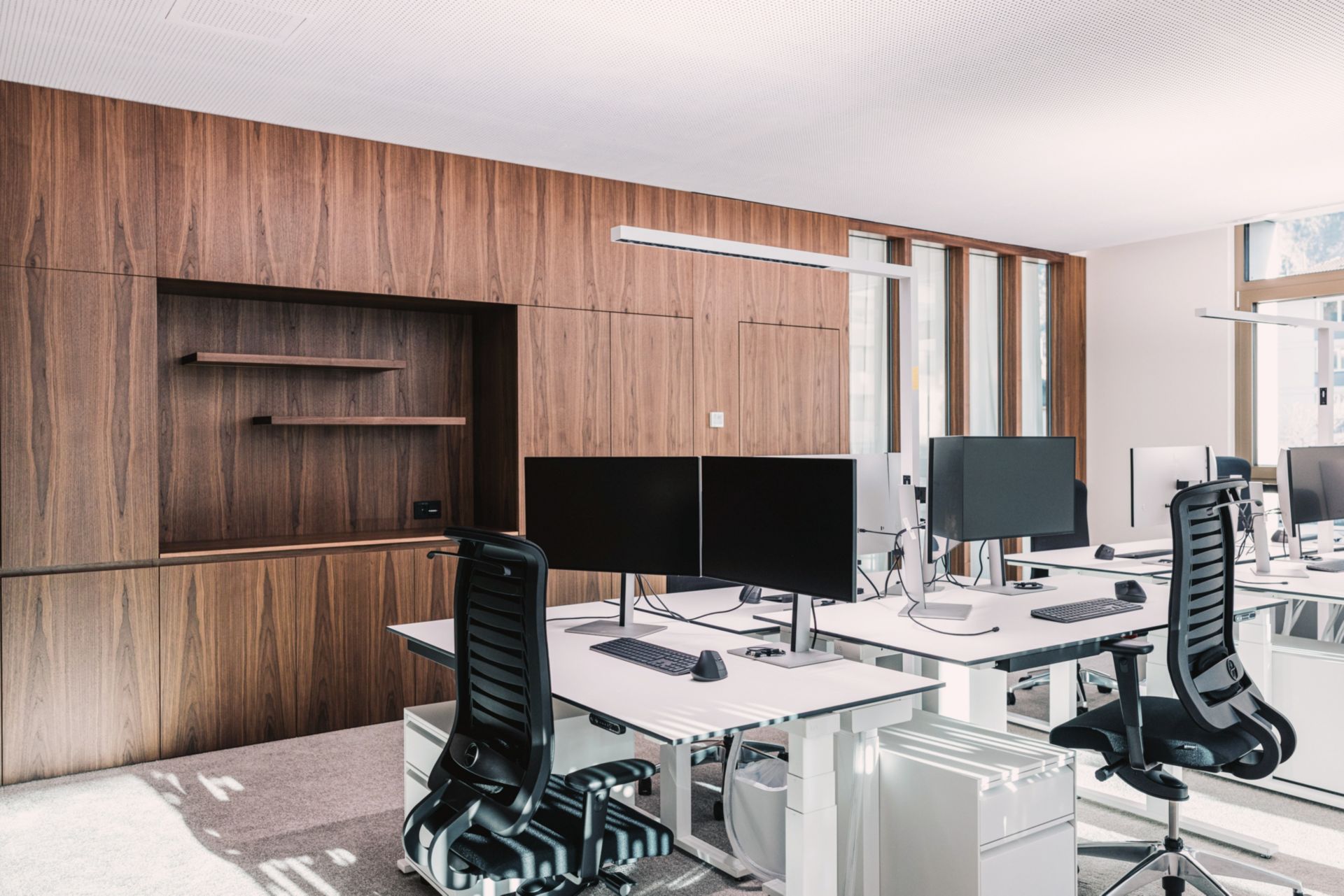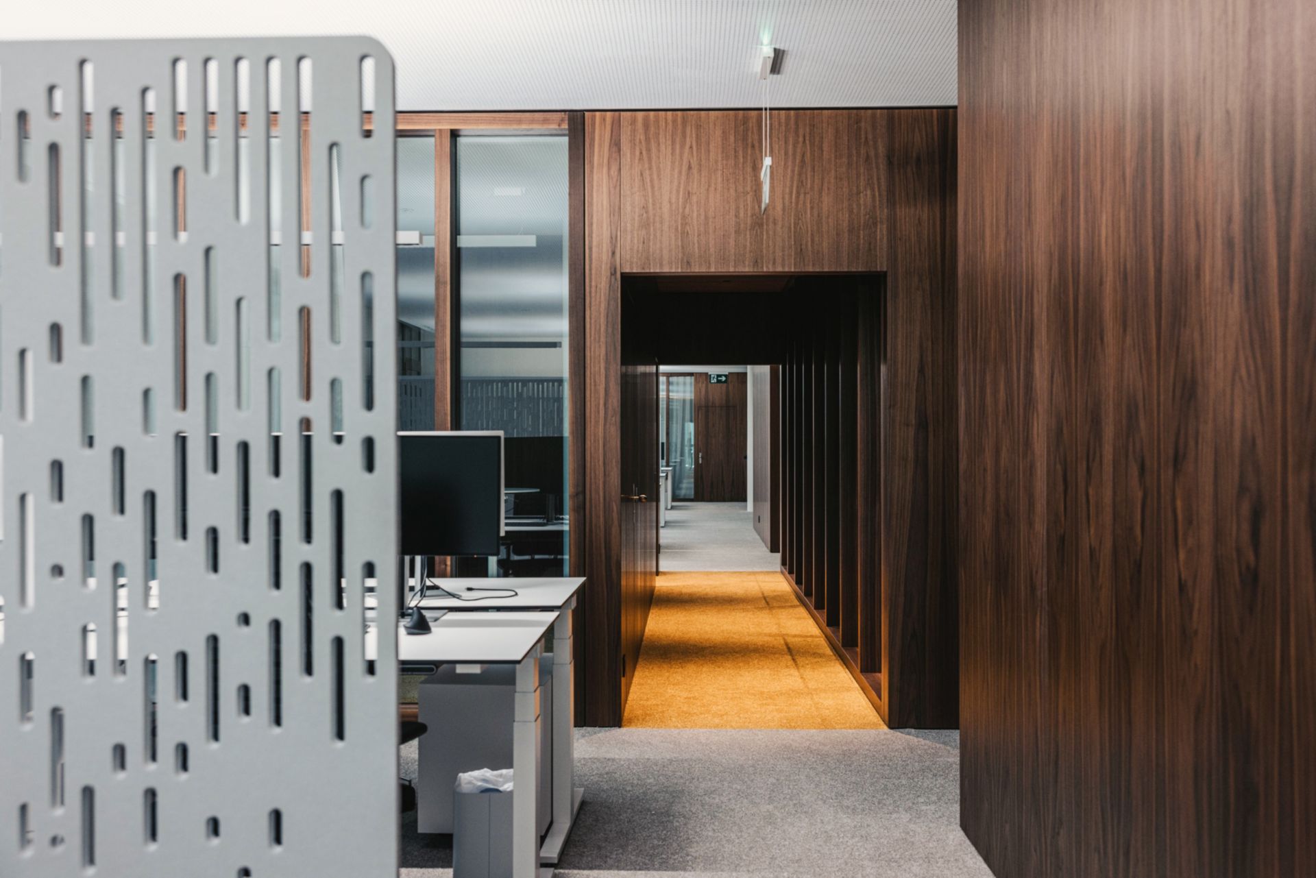 Au 1er étage, le noyau massif aux teintes boisées de noyer est fragmenté. Ces fragments de noyau participent à la distribution des espaces des open spaces de cet étage uniquement consacré aux collaborateurs et collaboratrices de la banque. Dans ces boîtes prennent place les bureaux de direction et les salons de replis. Ces derniers offrent une diversité de mobilier et apportent du confort et discrétion pour les petites réunions de groupe. L’image se veut intemporelle et soignée.