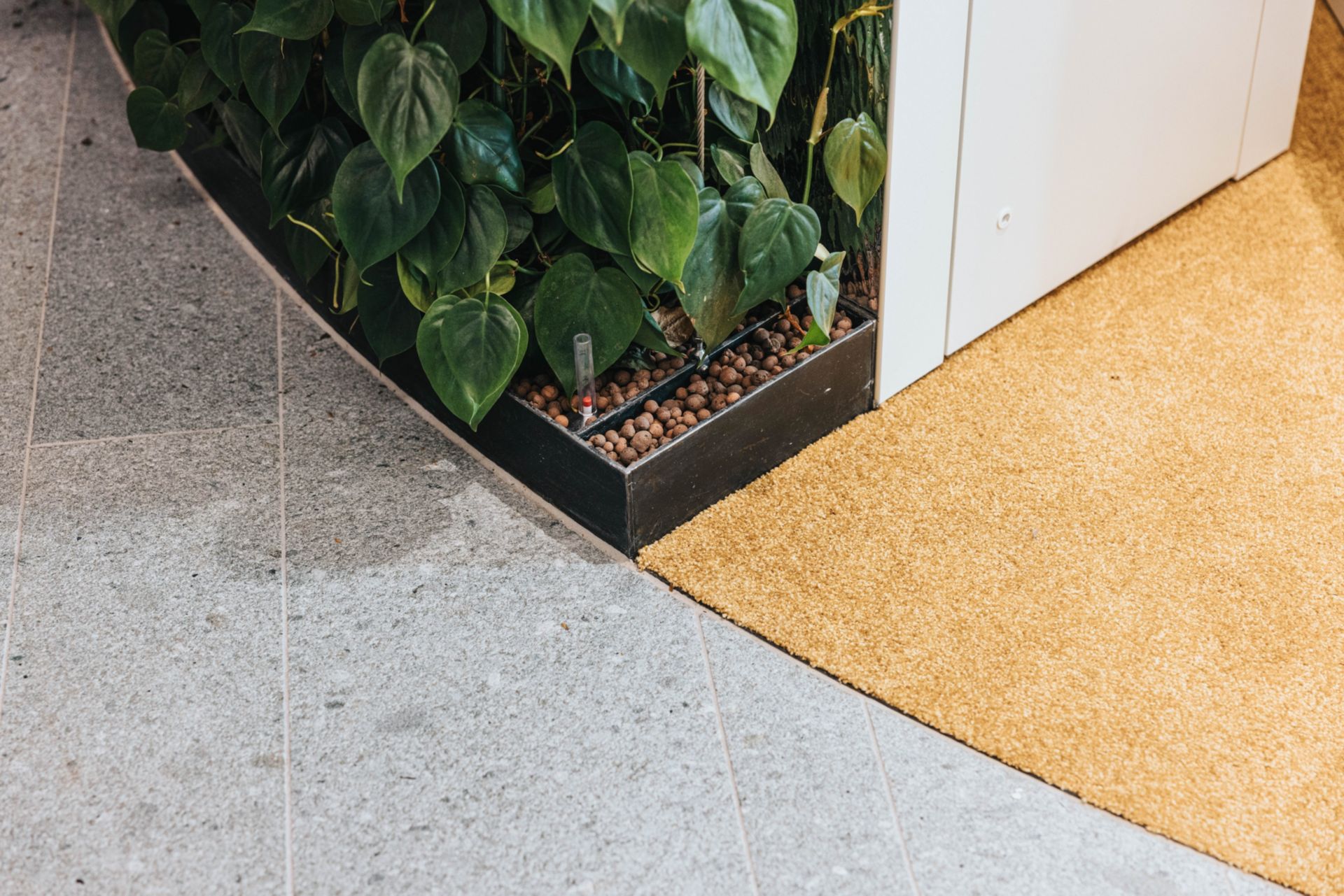 Au sol de l’open space, une moquette aux teintes gris poudré rappelle la minéralité et établit une atmosphère douce et propice à la concentration. Dans les salons de direction et de replis, ce même revêtement emprunte une couleur solaire qui confère à ces espaces fermés une inspiration 70’s.