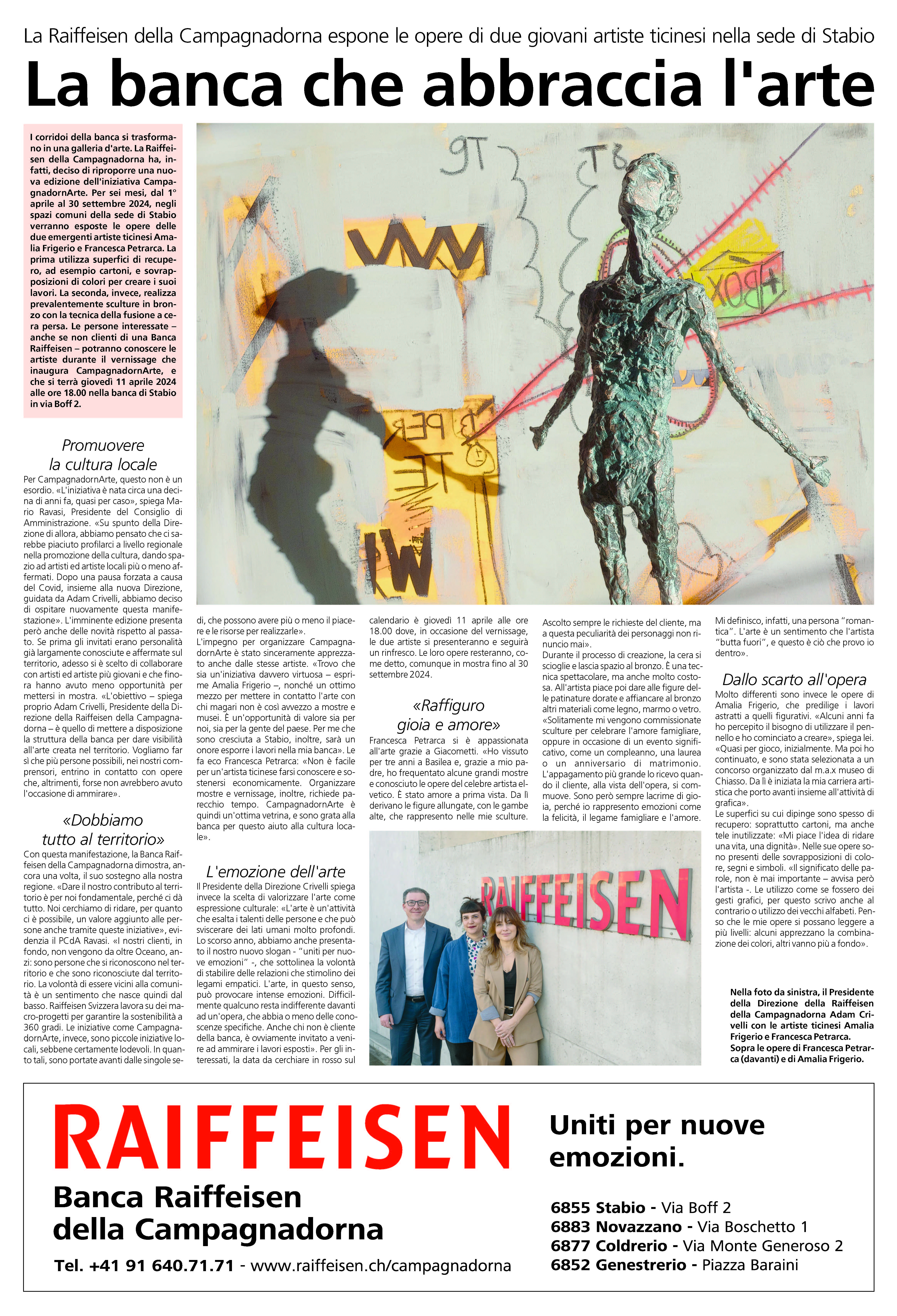 La Raiffeisen della Campagnadorna espone le opere di due giovani artiste ticinesi nella sede di Stabio