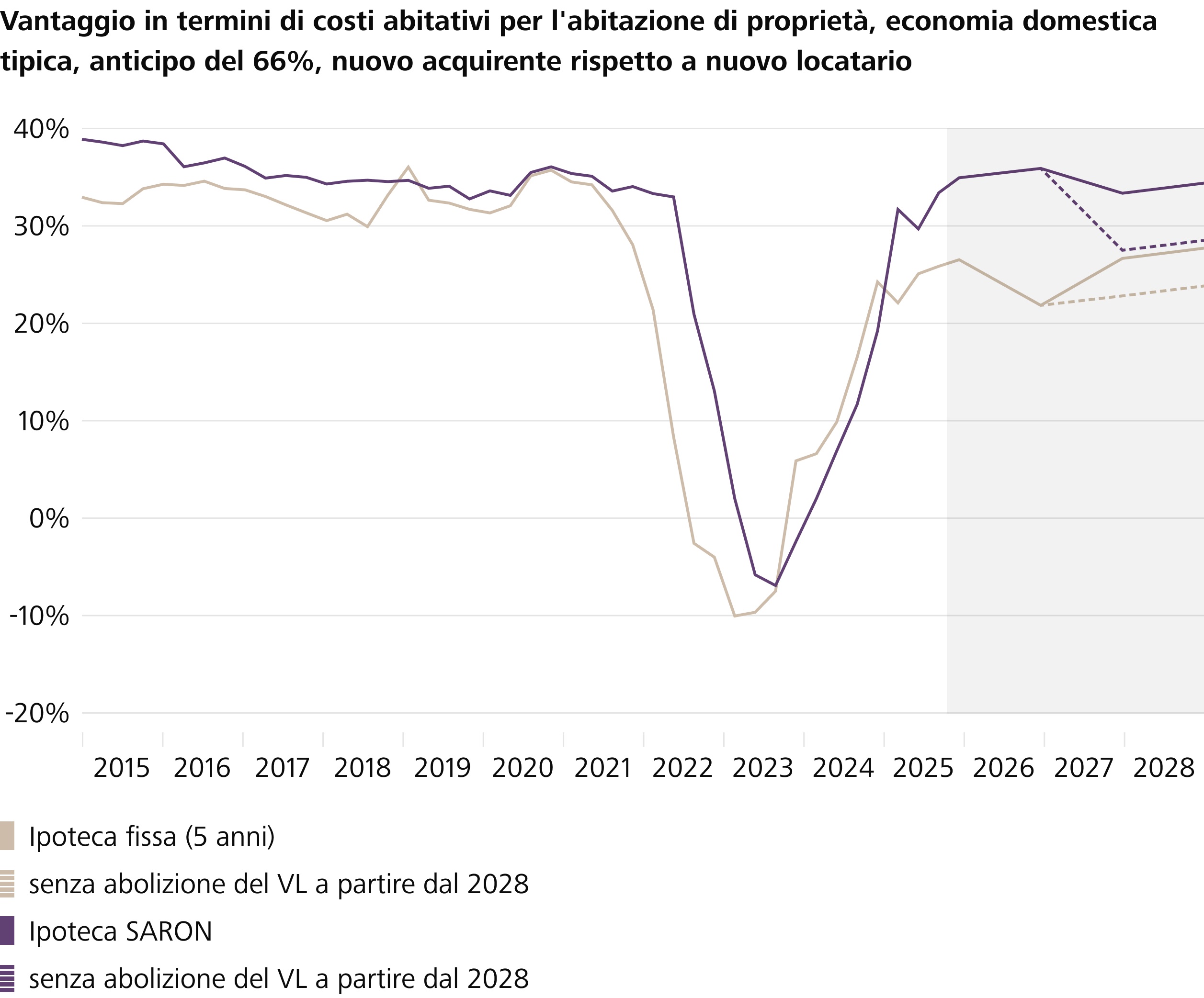 L'abolizione del valore locativo renderà ancora più allettante la proprietà abitativa. Tuttavia, gli incentivi all'acquisto di un'abitazione di proprietà sono elevati a prescindere dalla riforma fiscale approvata. Infatti, a seconda del tipo di finanziamento scelto, i futuri proprietari potranno risparmiare fino a un terzo dei costi abitativi rispetto all'affitto. «Anche dopo la riforma fiscale, per la stragrande maggioranza delle economie domestiche svizzere rimangono elevati gli ostacoli legati al capitale proprio e alla sostenibilità. Ciò impedisce a molti potenziali acquirenti di concretizzare le loro intenzioni di acquisto, motivo per cui l'abolizione del valore locativo non dovrebbe generare una grande domanda aggiuntiva e forti effetti sui prezzi», spiega Fredy Hasenmaile. Nonostante ciò, la dinamica dei prezzi per la proprietà abitativa rimane marcata, in particolare per il modello che si riteneva superato della casa unifamiliare. I regolamenti edilizi, che negli ultimi anni sono stati modificati in molte zone, prevedono in genere indici di sfruttamento notevolmente più elevati e consentono la costruzione di case plurifamiliari dove un tempo si potevano costruire solo case unifamiliari. Di conseguenza, il numero di nuove case unifamiliari in costruzione è in calo, non da ultimo a causa di considerazioni di rendimento. La grande penuria e la forte domanda, accentuata dalla concorrenza delle case plurifamiliari, fanno sì che i prezzi delle case unifamiliari continuino a salire in modo significativo.