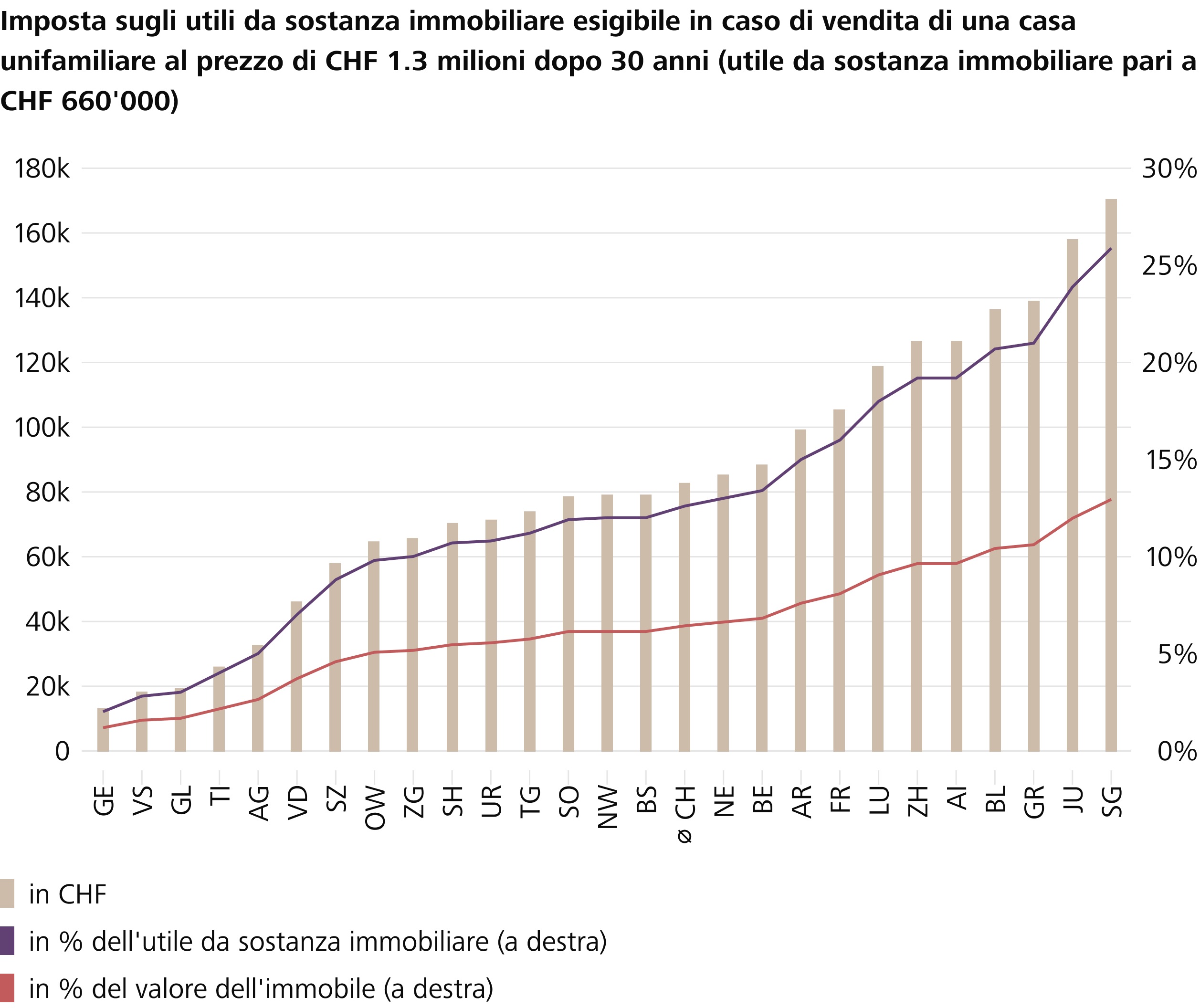 Sebbene le entrate statali derivanti dalle transazioni immobiliari siano diventate una parte irrinunciabile del bilancio statale nella maggior parte dei cantoni, la tassazione cantonale delle vendite immobiliari varia notevolmente. Ad esempio, non tutti i cantoni applicano un'imposta sul passaggio di proprietà. Esistono notevoli differenze anche nel calcolo dell'imposta sugli utili da sostanza immobiliare. Per una tipica casa unifamiliare, con un periodo di possesso di 30 anni e un utile da sostanza immobiliare di CHF 660'000, l'aliquota cantonale media su questo utile risulta essere del 12.6% (CHF 83'000). Tuttavia, per questo tipo di esempio, l'intervallo va da appena il 2% (CHF 13'000) nel cantone di Ginevra al 26% (CHF 170'000) nel cantone di San Gallo. «Sebbene in tutta la Svizzera si applichino gli stessi principi per la tassazione degli utili da sostanza immobiliare, i cantoni sfruttano ampiamente il loro notevole margine di manovra nell'attuazione specifica. I diversi metodi di calcolo degli utili realizzati, delle aliquote e delle detrazioni previste per la durata del possesso portano a un trattamento fiscale molto eterogeneo dei venditori di immobili a seconda del luogo in cui la proprietà viene venduta», afferma Fredy Hasenmaile.