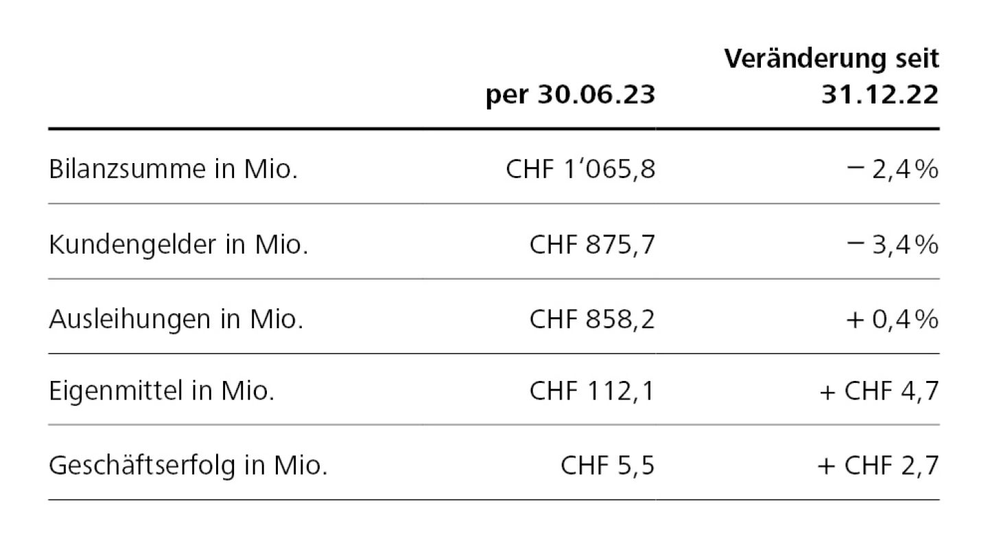 Die Zinswende der Schweizerische Nationalbank mit fünf aufeinanderfolgenden Leitzinserhöhungen führte zu einem ausserordentlichen Brutto-Erfolg im Zinsgeschäft von 7,7 Millionen Franken (+69,0%) im ersten Halbjahr 2023. Trotz höheren Zinsaufwänden aufgrund der Erhöhung auf den Passivzinsen konnten Zinserträge aus der Überschussliquidität und der Bilanzabsicherung zu diesem bemerkenswerten Ergebnis beitragen.