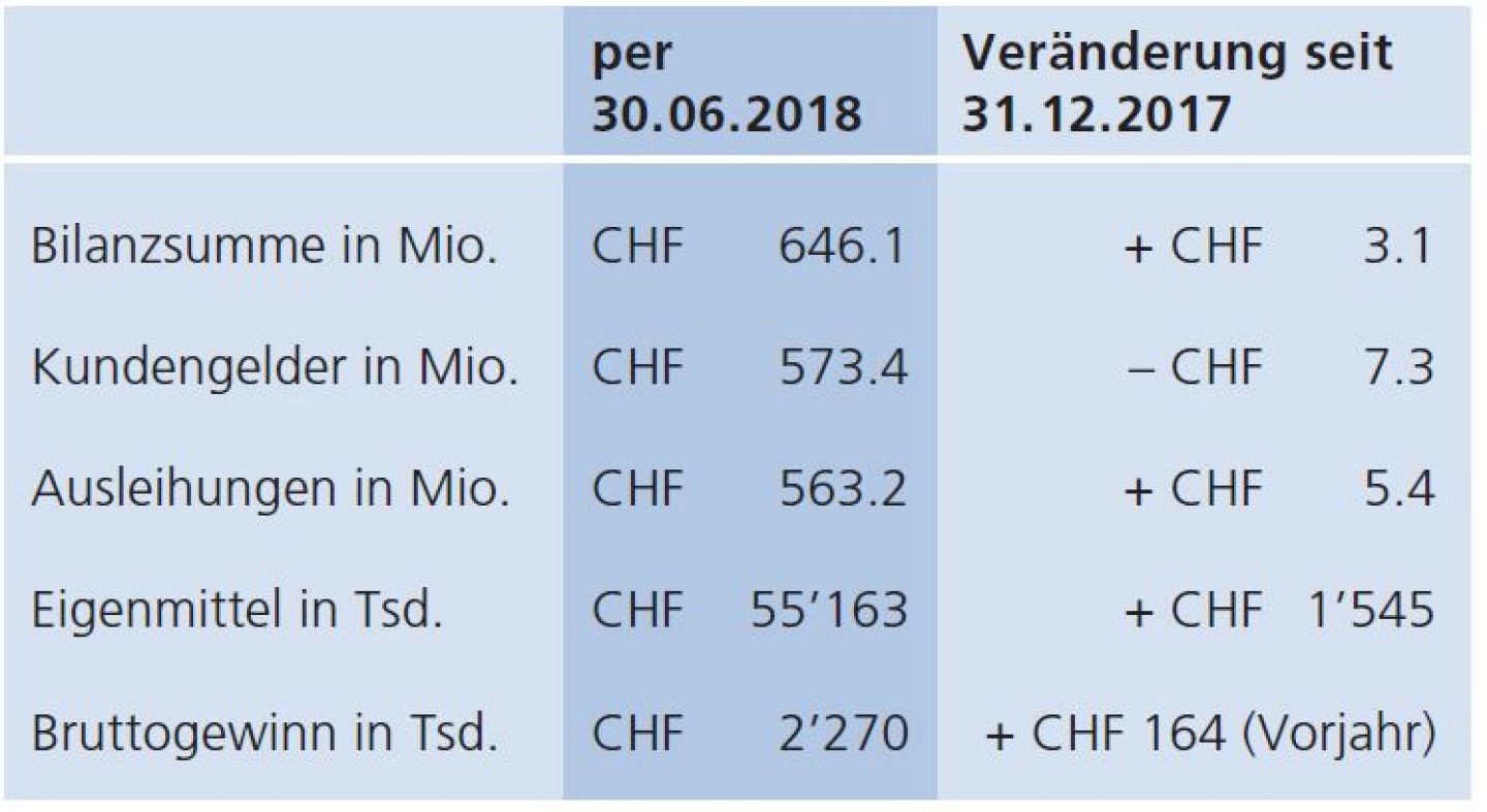 Ich freue mich, Ihnen erstmals seit meinem Eintritt in die Bank das Halbjahresergebnis präsentieren zu dürfen. Es ist erfolgreich ausgefallen – dies gleich vorweg: Die Bilanzsumme erhöhte sich auf CHF 646.1 Mio. Die Kundengelder reduzierten sich um 1.3% auf CHF 573.4 Mio., da viele Sparer angesichts der tiefen Zinsen Renditechancen in Anlagefonds suchen. Das Wachstum der Kundenausleihungen hielt mit 1.0% an und beträgt neu CHF 563.2 Mio.