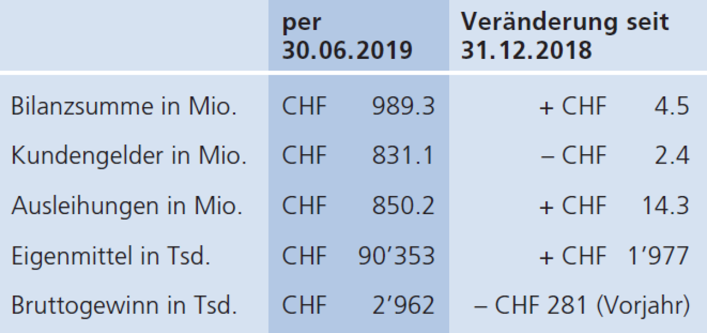 Die Bilanzsumme stieg auf 989 Millionen Franken. Die Ausleihungen nahmen netto um erfreuliche 14 Millionen auf 850 Millionen zu, während die Kundengelder leicht auf 831 Millionen Franken zurückgingen. Somit ist das Kreditvolumen praktisch vollumfänglichdurch Kundengelder refinanziert.