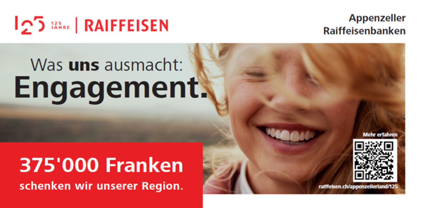 Als verantwortungsvolle Genossenschaftsbank bringt sich Raiffeisen seit 125 Jahren in der Schweizer Wirtschaft und Gesellschaft ein. Als nachhaltig wirtschaftendes Unternehmen legt sie den Fokus auf Stabilität und Verlässlichkeit. In den vergangenen 125 Jahren hat sich das Bankgeschäft verändert. Geblieben sind das genossenschaftliche Geschäftsmodell und die starke Verankerung in den Regionen. Aus diesem Selbstverständnis heraus engagieren sich die die Appenzeller Raiffeisenbanken anlässlich des 125-Jahr-Jubiläums in der Region und unterstützen mit je zusätzlichen CHF 125'000 lokale Projekte. Die Mitglieder können zudem die Schweiz entdecken und profitieren von über 125 Angeboten, wie Vorzugskonditionen bei Hotels, Erlebnissen und dem öffentlichen Verkehr. Zusätzlich kommen sie in den Genuss von saisonalen Highlights wie Thermal- & Erlebnisbäder, Schifffahrten, Bergbahnen und Panoramazüge, bei denen die Mitglieder von 50% Rabatt profitieren. Seit 125 Jahren und auch im Jubiläumsjahr engagieren sich die Appenzeller Raiffeisenbanken – genau das macht Raiffeisen aus.