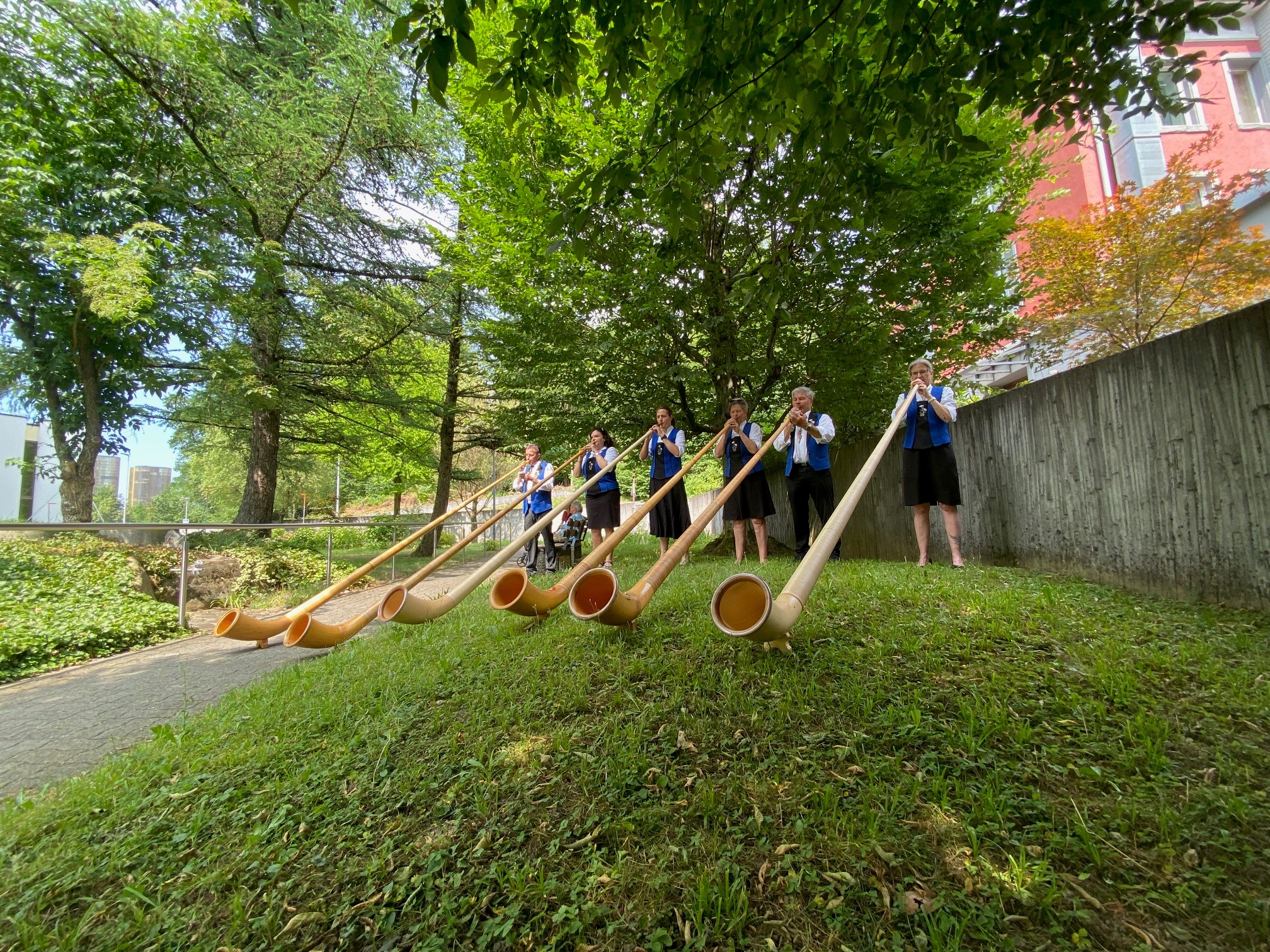Wunderbar volkstümliche Klänge waren an diesem Mittwochnachmittag im Garten zu hören. Die Alphornbläser-Vereinigung Luzern spielte im Namen der Raiffeisenbank Horw vor zufriedenen und glücklichen Bewohnerinnen und Bewohner auf. Auch die Mitarbeitenden der Werkstätten liessen es sich nicht nehmen eine Pause zu machen und dem Konzert beizuwohnen. Das Konzert bot eine schöne musikalische Abwechslung zum Heim- und Arbeitsalltag.