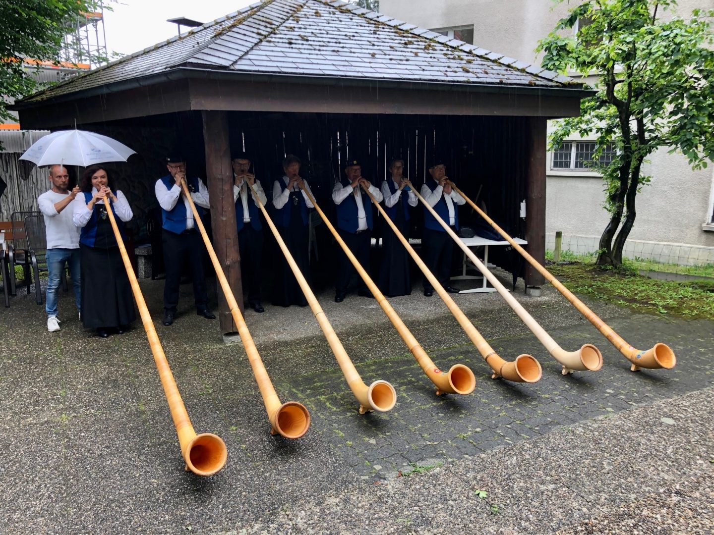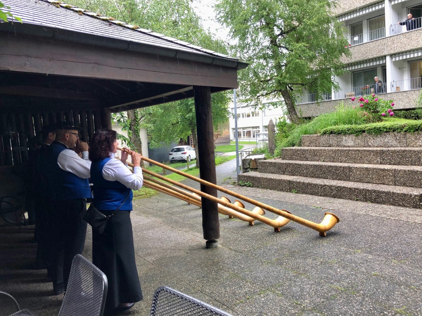 Die Alphornbläser-Vereinigung brachte trotz Regen willkommene Abwechslung in den Heimalltag.