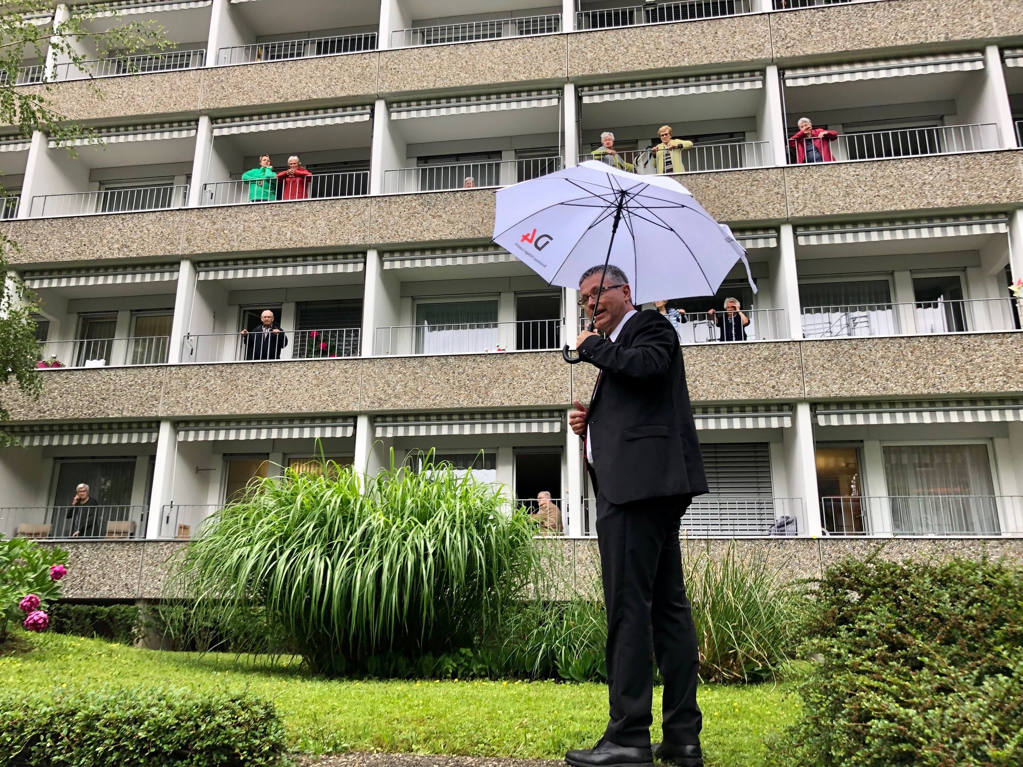 Daniel Hofmann, Vorsitzender der Bankleitung der Raiffeisenbank Horw begrüsste die Bewohnenden auf den Balkonen.