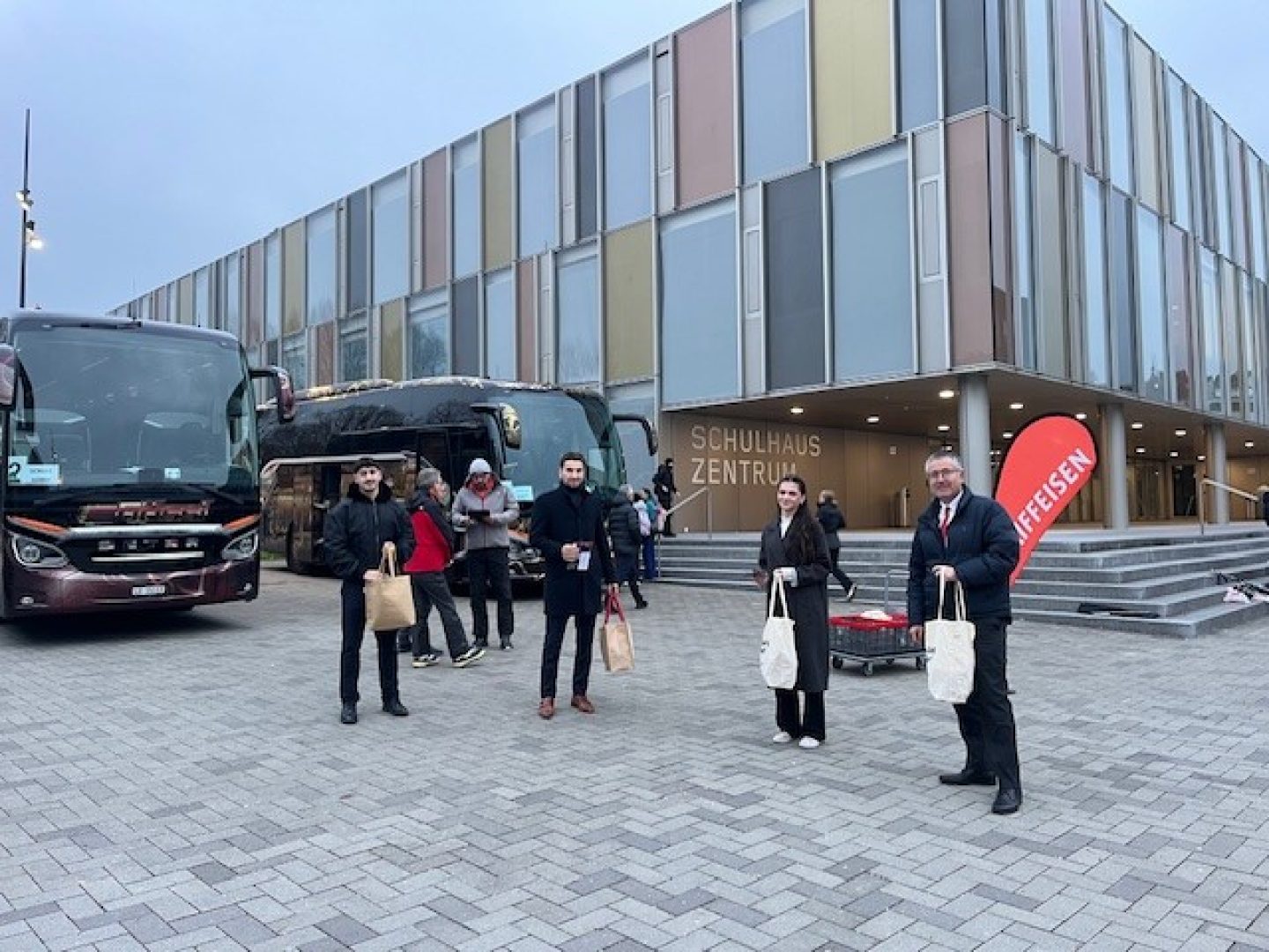 Bevor die Schülerinnen und Schüler in die Busse stiegen, erhielten sie von den Mitarbeitenden der Raiffeisenbank Horw einen Gutschein sowie ein Ragusa-Schöggeli. Dank der finanziellen Unterstützung der Raiffeisenbank Horw, stand einem unvergesslichen Tag im Schnee nichts mehr im Wege.