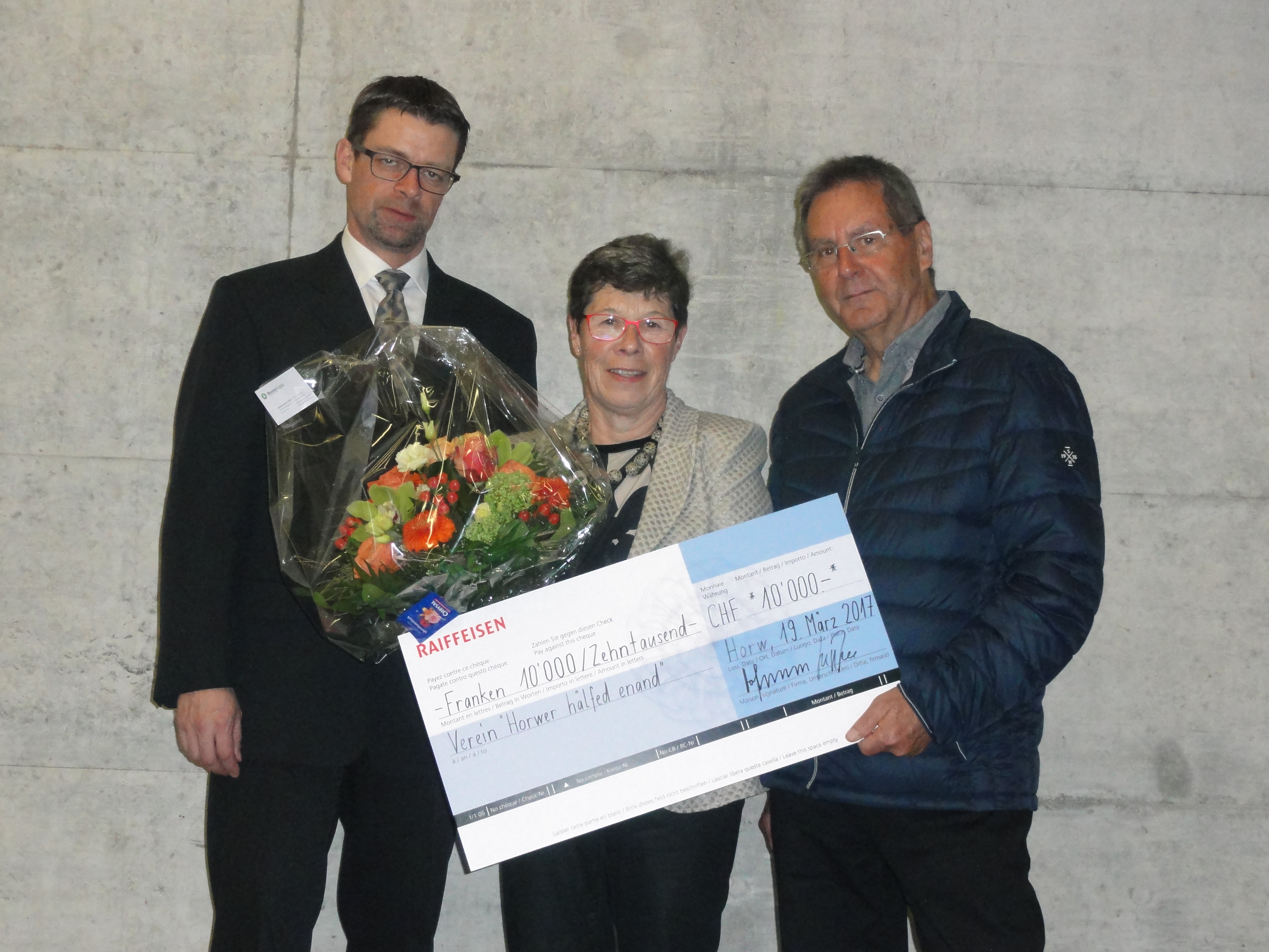 Seit Jahren unterstützt die Raiffeisenbank Horw gemeinnützige Institutionen mit einem Förderpreis in der Höhe von 10‘000 Franken. Dieses Mal geht der Betrag an „Horwer hälfed enand“. Die Einrichtung ist 1988 aus der ehemaligen Fürsorgekommission/Winterhilfe entstanden und ist seit 2014 ein Verein. Gemäss Statuten unterstützt „Horwer hälfed enand“ Menschen mit Wohnsitz in der Gemeinde Horw, welche vorübergehend in finanzielle Not geraten sind und für welche die Möglichkeiten der sozialen Institutionen wie z.B. die Sozialhilfe, die Arbeitslosenversicherung, Ergänzungsleistungen usw. ungenügend sind oder ganz fehlen. Alleine im Rechnungsjahr 2015/2016 wurden rund 100'000 Franken ausbezahlt. Die 108 eingereichten und bewilligten Gesuche betrafen 248 Personen.