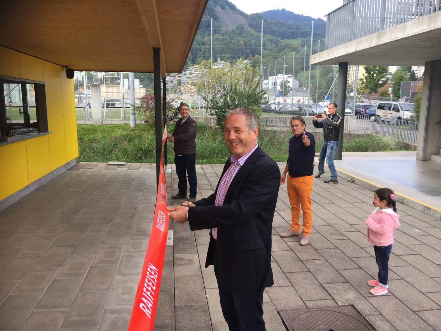 Feierliche Eröffnung des "Raiffeisen Corners": Ruedi Burkard Gemeindepräsident von Horw und Daniel Hofmann von der Raiffeisenbank Horw in Aktion unter freudiger Beobachtung von FC Horw Präsident Albert Kaufmann.