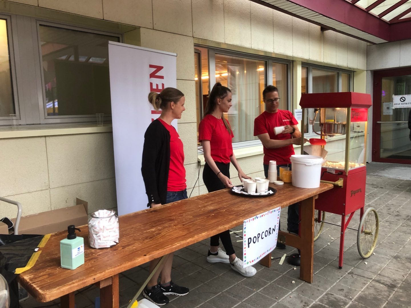 Die Mitarbeitenden der Raiffeisenbank Horw beim Popcorn verteilen.