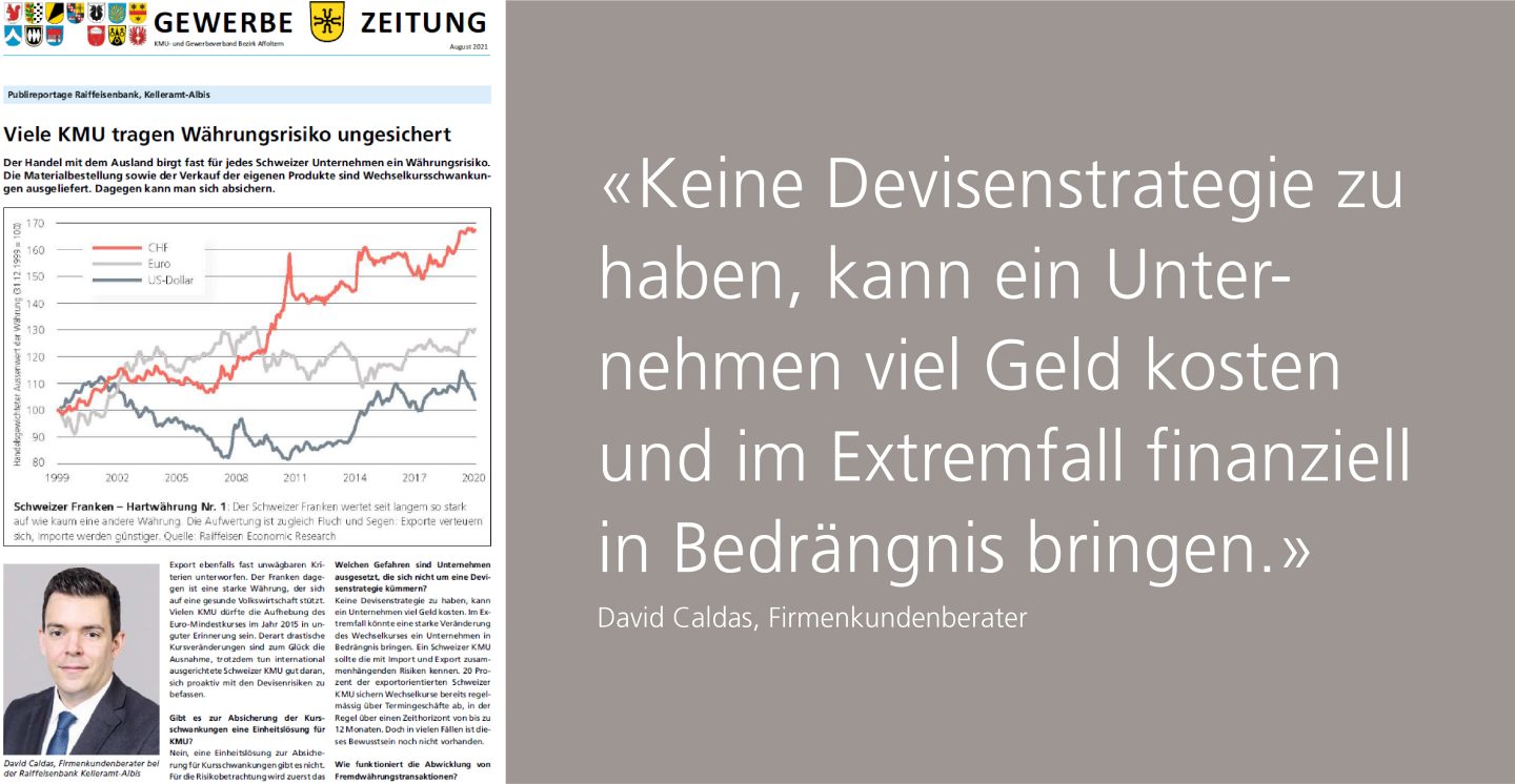 Der Handel mit dem Ausland birgt fast für jedes Schweizer Unternehmen ein Währungsrisiko. Materialbestellungen und der Verkauf von eigenen Produkten sind Wechselkursschwankungen ausgeliefert. Gerne zeigen wir Ihnen in der aktuellen Ausgabe der Gewerbezeitung Bezirk Affoltern auf, wie Sie Ihre Unternehmung gegen Kursschwankungen absichern können.