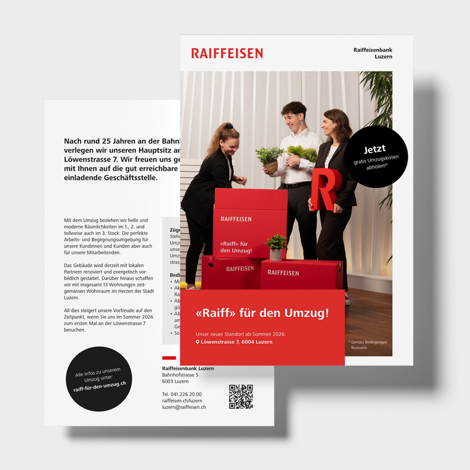 Nach rund 25 Jahren an der Bahnhofstrasse 5 zieht die Raiffeisenbank Luzern um. Ab Sommer 2026 begrüssen wir Sie an unserem neuen Hauptsitz an der Löwenstrasse 7.