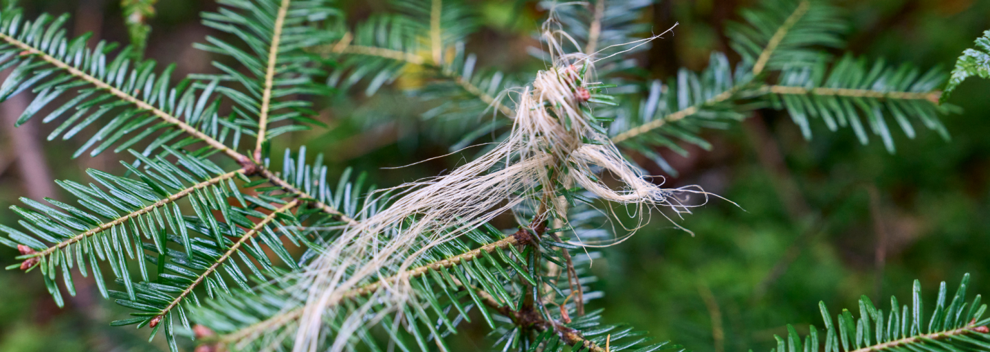 Um zu verhindern, dass das Reh die Knospe der jungen Weisstanne frisst, wird Industriehanf leicht um die oberste Knospe gewickelt. Das Material kitzelt die Rehe an der Nase, so dass diese die Knospe nicht mehr fressen.