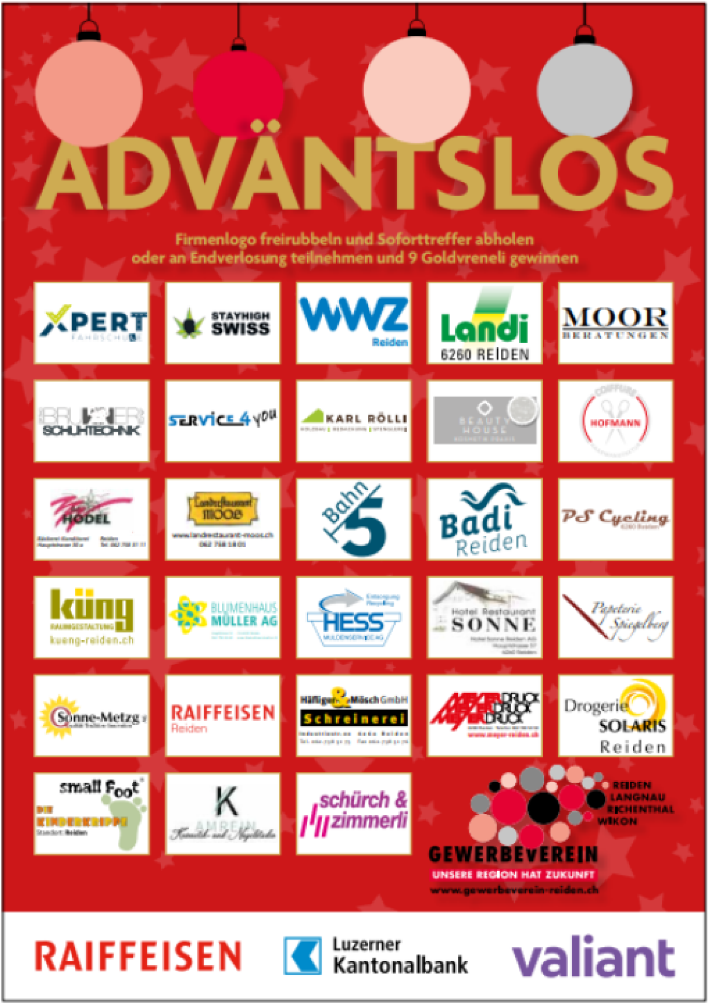 Während der Adventszeit zwischen dem 27. November und dem 24. Dezember 2023 werden vom Reidner Gewerbe wieder "Adväntslose" verteilt. Knapp dreissig Mitglieder des Gewerbevereins verteilen rund 22'000 Lose. Der Gesamtwert des Gewinnes beläuft sich auf rund 55'000 Franken. Rubbeln Sie die silbrige Fläche frei und wenn da ein Firmenlogo der teilnehmenden Betreibe erscheint, haben Sie direkt einen Soforttreffer gewonnen. Gehen Sie mit dem Los in den entsprechenden Betrieb und holen sich Ihren Gewinn ab.