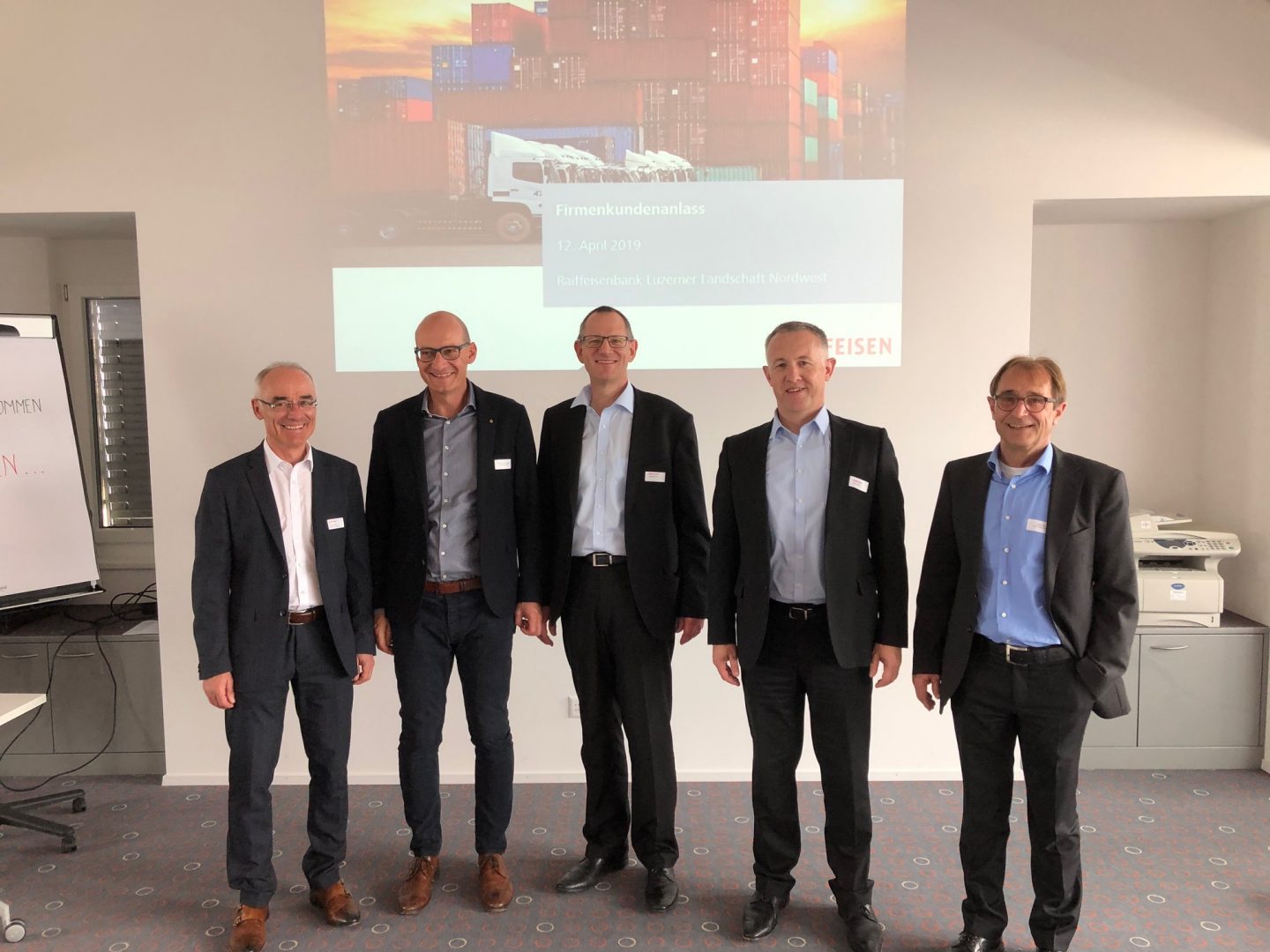 Am 12. April 2019 über den Mittag hat in Schötz der Firmenkundenanlass stattgefunden. Das Thema Leasing wurde von Walter Stöckli, Raiffeisen Schweiz, vorgestellt. Thomas Zimmermann und Walter Iten aus dem Raiffeisen Unternehmsnzentrum haben die Firmenkunden über die Nachfolgeplanung informiert. Der Abschluss bildete der Stehlunch mit interessanten und angeregten Gesprächen.