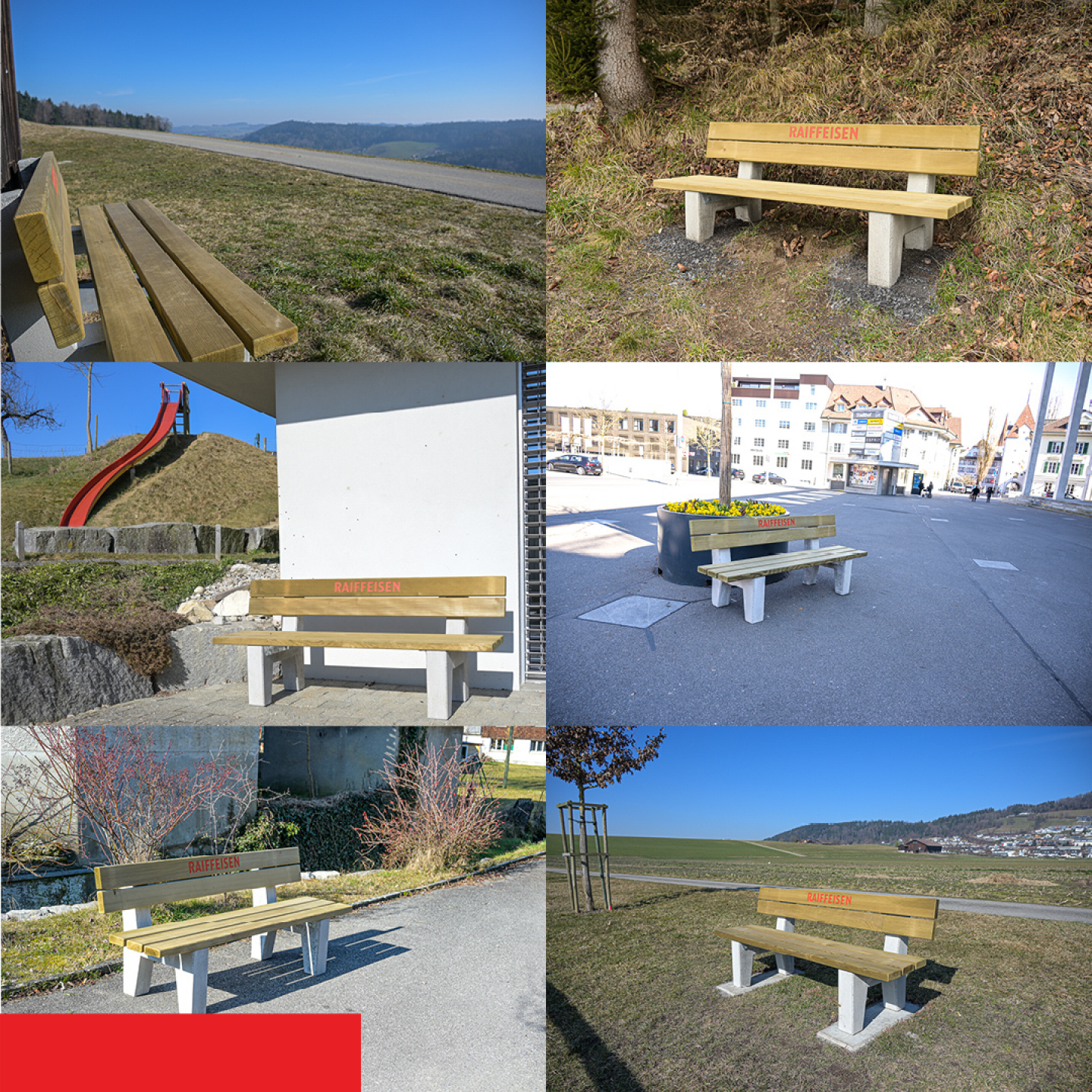 Die schönen Holzbänke mit dem Raiffeisenlogo sind von der Bürli Spiel- und Sportgeräte AG in St. Erhard.