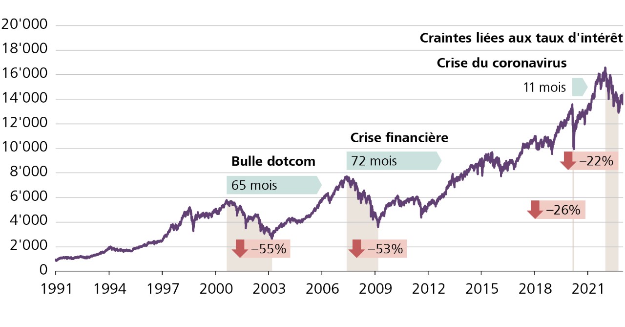 Mais chaque effondrement a été suivi d'un redressement. La bourse s'est remise de la crise de la bulle internet en 65 mois et, après la crise du coronavirus, il n'a fallu que onze mois aux titres pour retrouver leur niveau d'avant la pandémie.