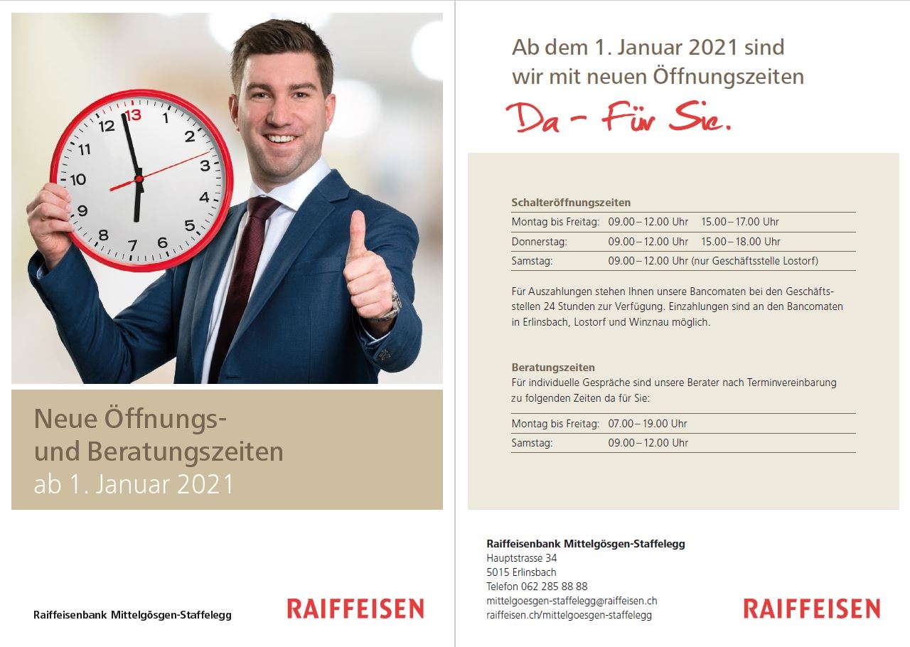 | Montag bis Freitag: 09.00 - 12.00 Uhr 15.00 - 17.00 Uhr Donnerstag: 09.00 - 12.00 Uhr 15.00 - 18.00 Uhr Samstag: 09.00 - 12.00 Uhr (nur Geschäftsstelle Lostorf) | |