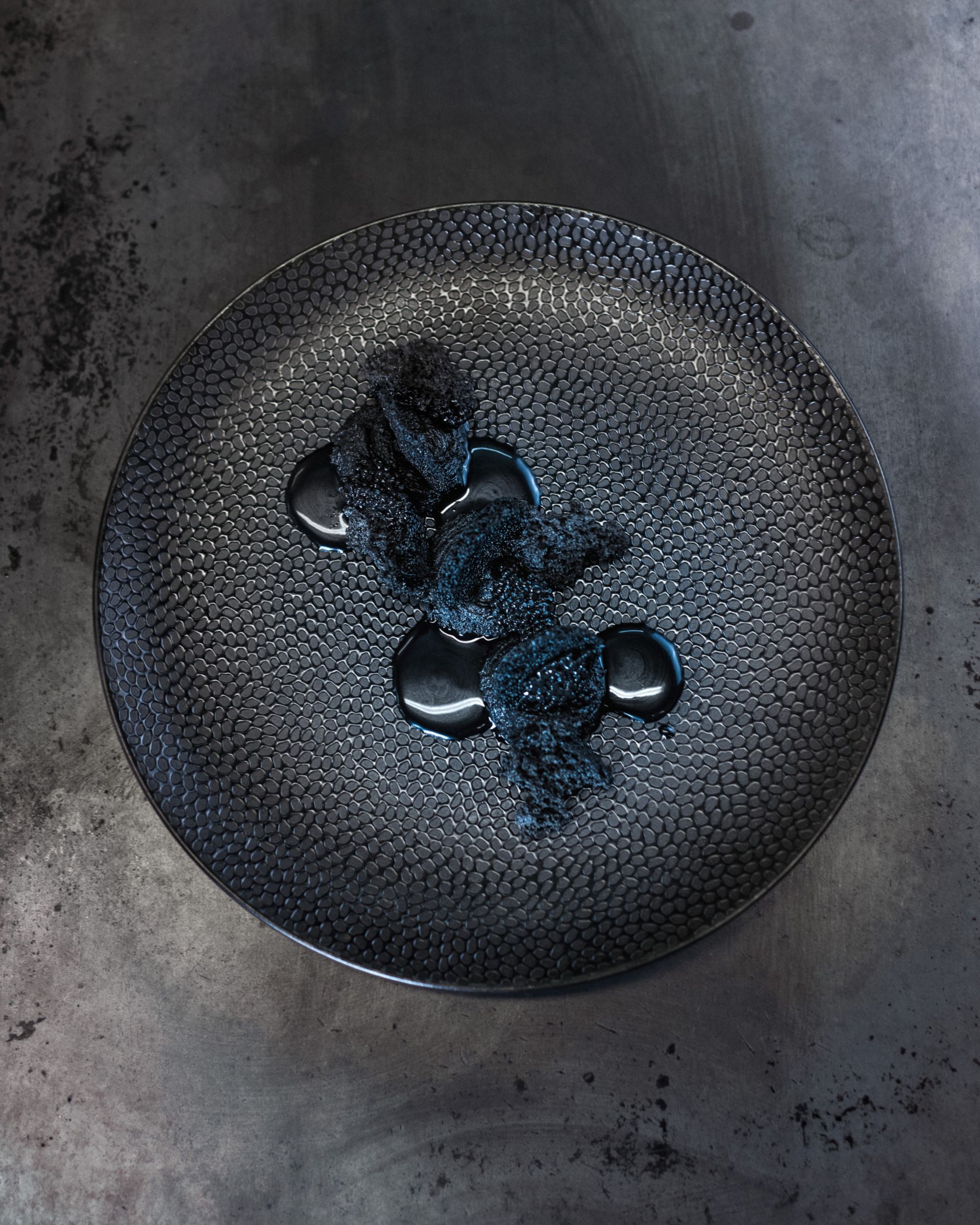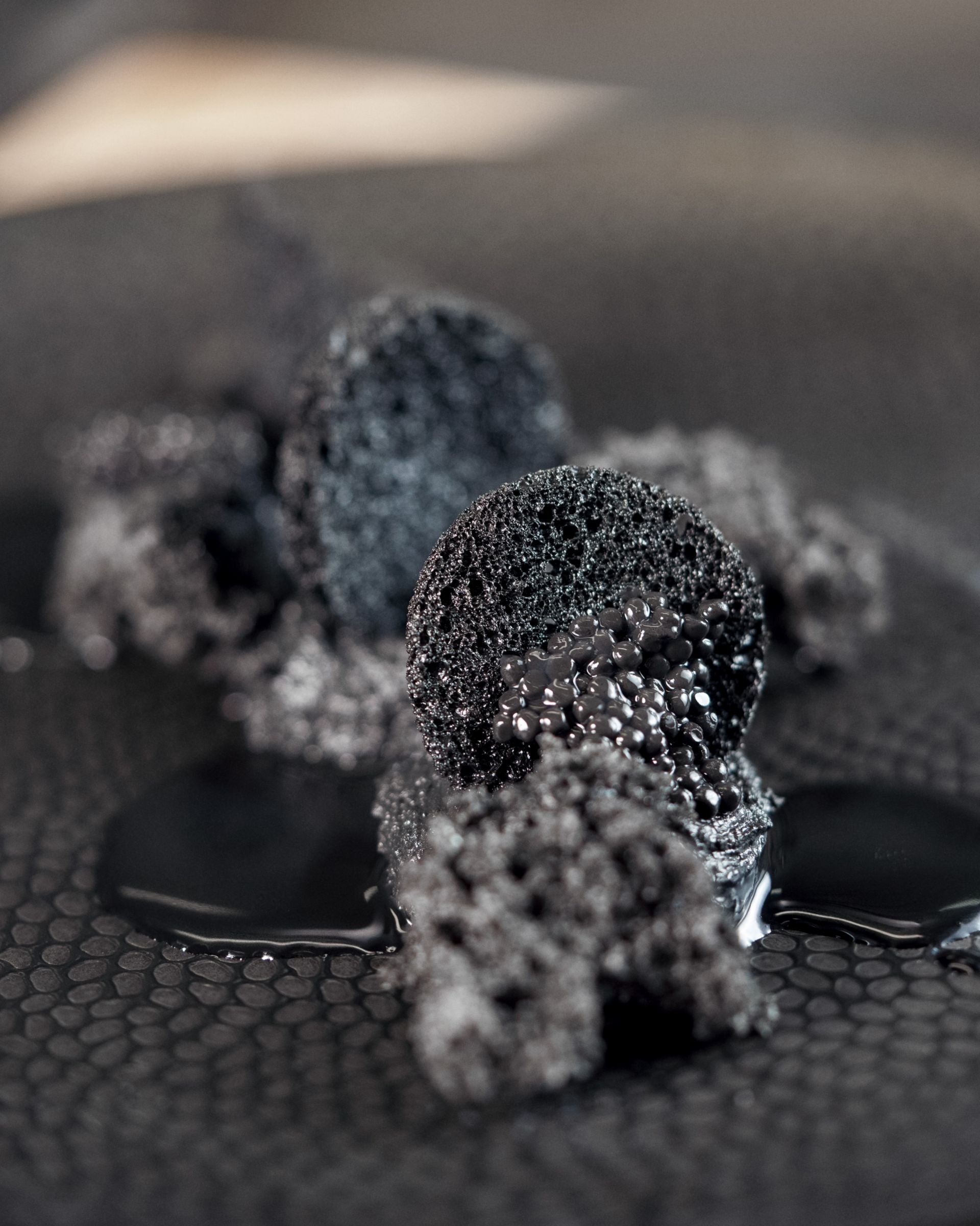 Romain nous fait déguster deux de ses créations emblématiques. Comme entrée, il propose le sublime iode en monochrome : houmous de lentilles beluga et caviar de hareng fumé, sponge cake aux algues et hollandaise à la bonite séchée. Comme plat, une évasion incroyable avec son râble de lapin farci au riz de veau, jus réduit au romarin et citron confit.