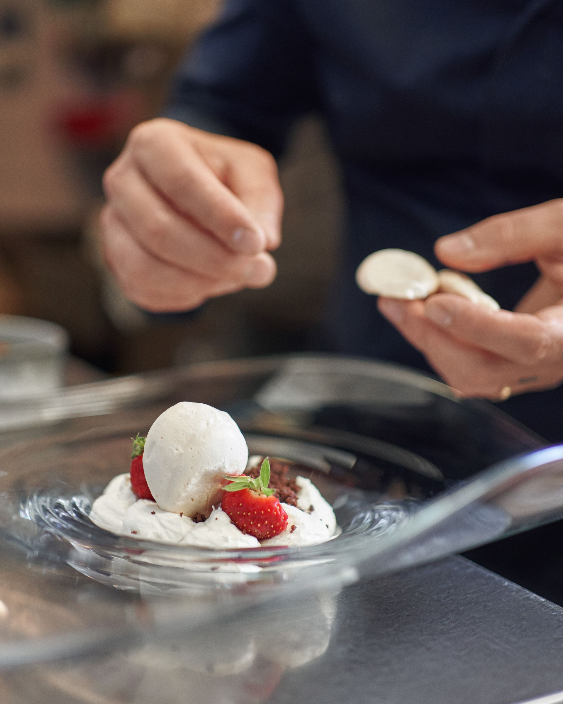 Pour Romain, la cuisine, c’est d’abord un partage, et c’est en salle avec ses clients, à qui il raconte ses plats, qu’il le vit à chaque service.