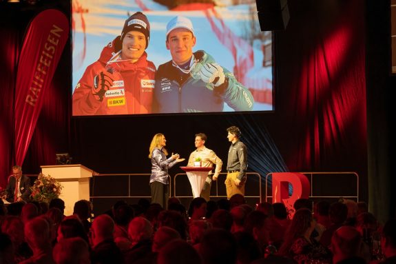 Die Bank engagiert sich lokal unter anderem auch im Sponsoringbereich und der Jugendförderung. Hierzu wurden die beiden Skialpin-Rennfahrer Josua Mettler und Marco Fischbacher auf die Bühne geholt. Beide Athleten werden seit Kindesbeinen an von der Raiffeisenbank Obertoggenburg auf ihrem Weg zur Weltspitze begleitet und unterstützt. Moderatorin Regula Elsener kitzelte beim Interview die ein oder andere Anekdote aus den beiden Sportlern heraus. Die Mitglieder im Saal erhielten so einen spannenden Einblick in die Welt des Spitzensports.