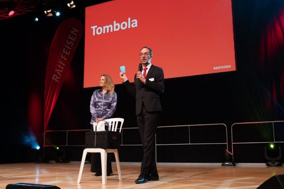 Tombola wurde moderiert von Regula Elsener und Tobias Bruderer, Mitglied der Bankleitung -