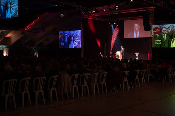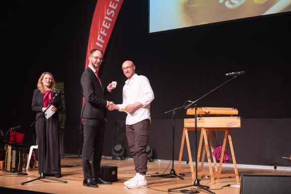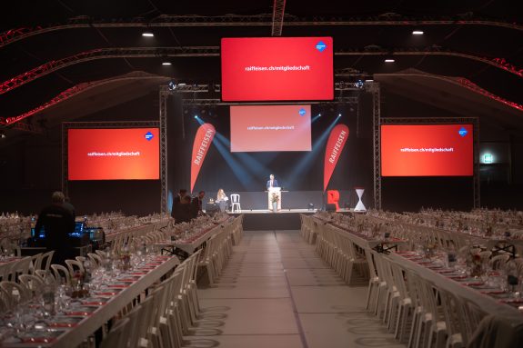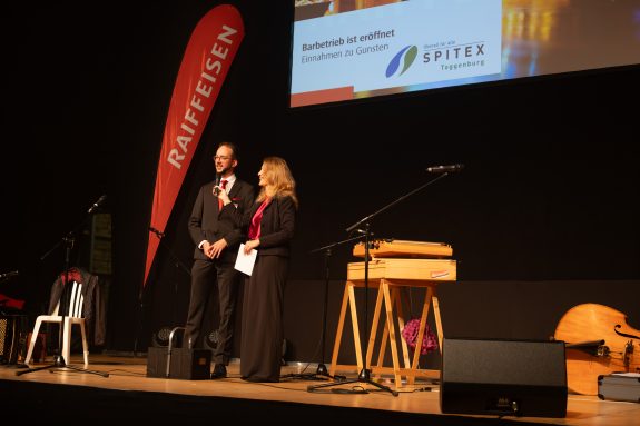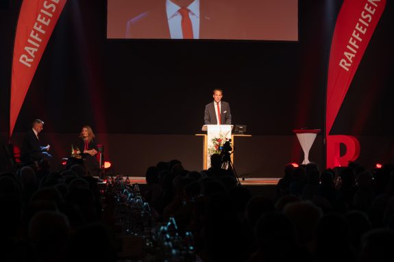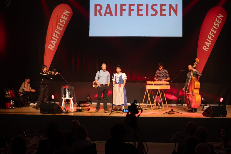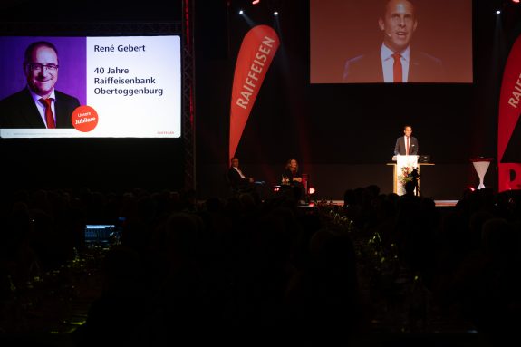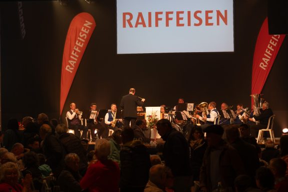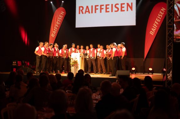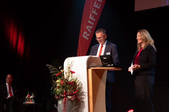 Als letzter Programmpunkt und in verkürzter Abfolge durften die glücklichen Gewinner:innen an der traditionellen Tombola Gutscheine des örtlichen Gewerbes sowie Artikel aus dem Raiffeisensortiment entgegennehmen. An der Live-Ziehung gegen Ende des Abends zogen Tobias Bruderer, Mitglied der Bankleitung und Moderatorin Regula Elsener auf der Bühne den Gewinner des Tombola-Hauptpreises: einen Goldbarren im Wert von rund Fr. 200.00.
