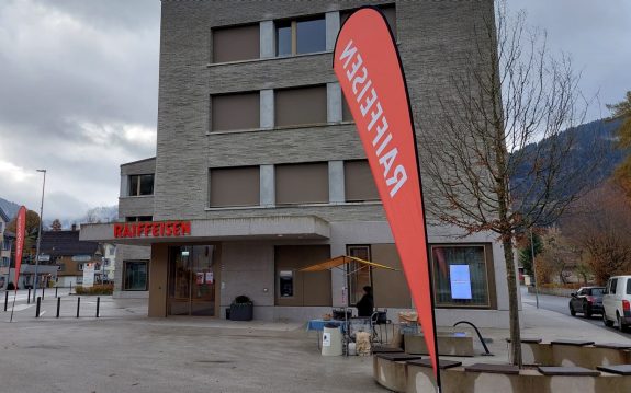 Bankvorplatz mit Raiffeisen-Marronistand