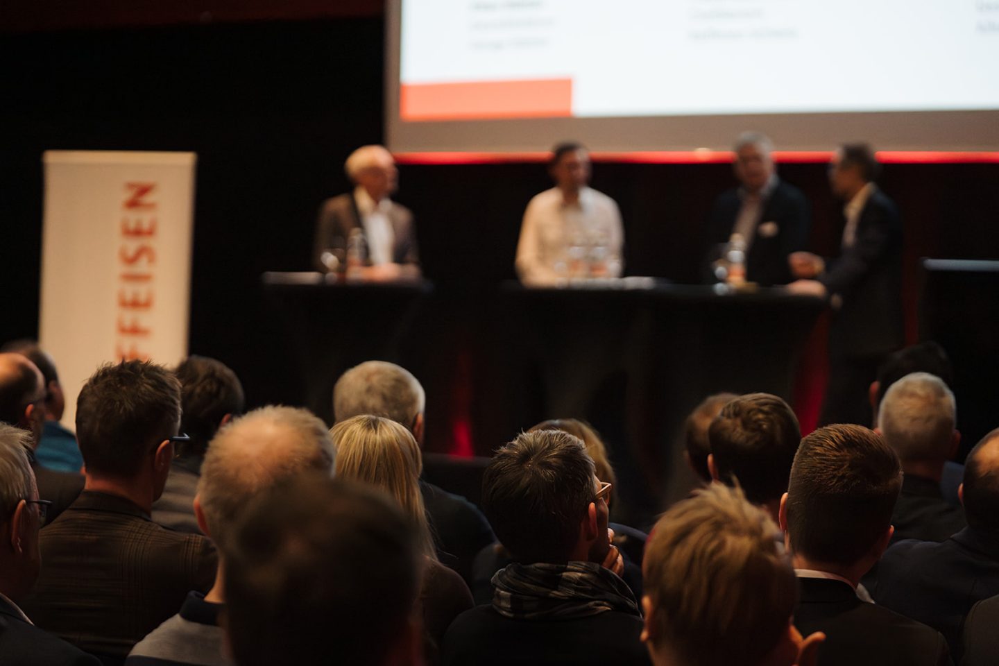 Im anschliessenden Podium diskutierten Fredy Hasenmaile, Kilian Blättler (Geschäftsführer Garage Blättler AG), Sämi Zumstein (Geschäftsführer Alltec AG) zusammen mit Roland Omlin (Leiter Firmenkundenberatung Raiffeisenbank Obwalden) über die wirtschaftliche Entwicklung in der Schweiz und im Kanton Obwalden sowohl auch über das Thema "Wirtschaft ist Teamarbeit" der aktuellen Firmenkunden-Kampagne der Raiffeisenbank Obwalden.