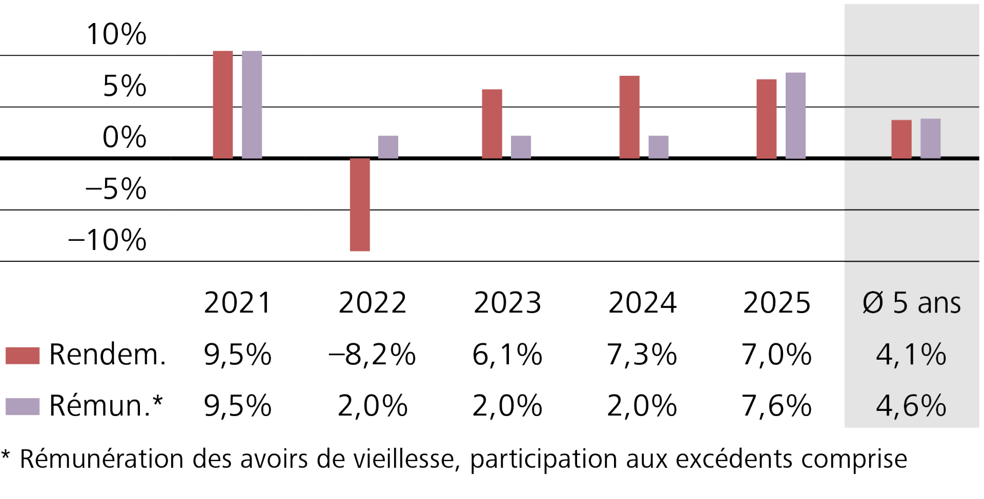 Il y a tout lieu de souligner l’assise financière solide de notre Caisse de retraite. Avec un degré de couverture de 117,4%, nous avons débuté l’exercice sous revue avec le plein de réserves de fluctuation de valeur. Nos membres ont ainsi pu profiter pleinement du résultat des placements, une nouvelle fois très réjouissant. En 2025, les avoirs de vieillesse de nos assurés ont été rémunérés à 7,6% au total (dont 5,6 points de pourcentage sous forme de rémunération supplémentaire issue de la Participation aux excédents). Au cours des cinq dernières années, nous avons pu rémunérer les avoirs de vieillesse à 4,6% en moyenne, ce qui nous place parmi les caisses de pension les plus performantes.