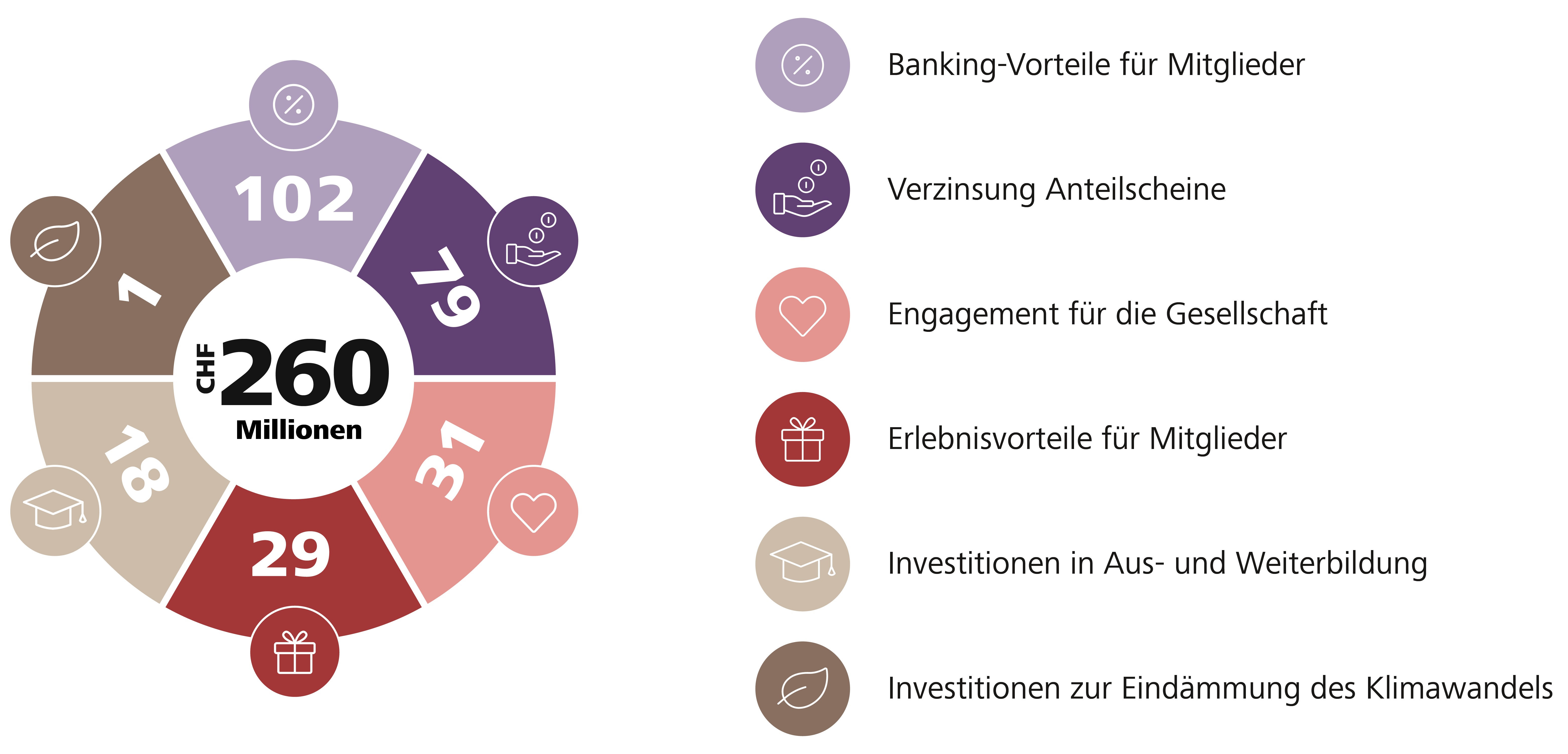 Das Genossenschaftsmodell und die Nähe zu ihren Kundinnen und Kunden machen die Raiffeisen Gruppe unverwechselbar. Den Mehrwert, den die Bankengruppe für Mitglieder und die Schweizer Gesellschaft schafft, misst Raiffeisen mit ihrem Mehrwert-Barometer. 2022 haben die Raiffeisenbanken und Raiffeisen Schweiz einen Mehrwert von 260 Millionen Franken für Gesellschaft und Mitglieder generiert. Genossenschafterinnen und Genossenschafter profitierten 2022 von 210 Millionen Franken in Form von vergünstigten Bankprodukten, der Verzinsungen von Anteilscheinen oder Mitgliedervorteilen. 31 Millionen Franken hat Raiffeisen in Form von Spenden und Sponsorings – inklusive der finanziellen Beiträge der Raiffeisen Jubiläumsstiftung – vergeben. In die Aus- und Weiterbildung ihrer über 11'000 Mitarbeitenden hat die Gruppe 18 Millionen Franken investiert. Neben den Massnahmen zur Stärkung der Nachhaltigkeit in den einzelnen Geschäftsfeldern der Genossenschaftsbank, hat Raiffeisen Investitionen zur Eindämmung des Klimawandels getätigt. Insgesamt eine Million Franken hat Raiffeisen an die Klimastiftung Schweiz, den internen Klimafonds für Energieeffizienzmassnahmen und die Kompensation der verbleibenden CO₂-Emissionen bezahlt.